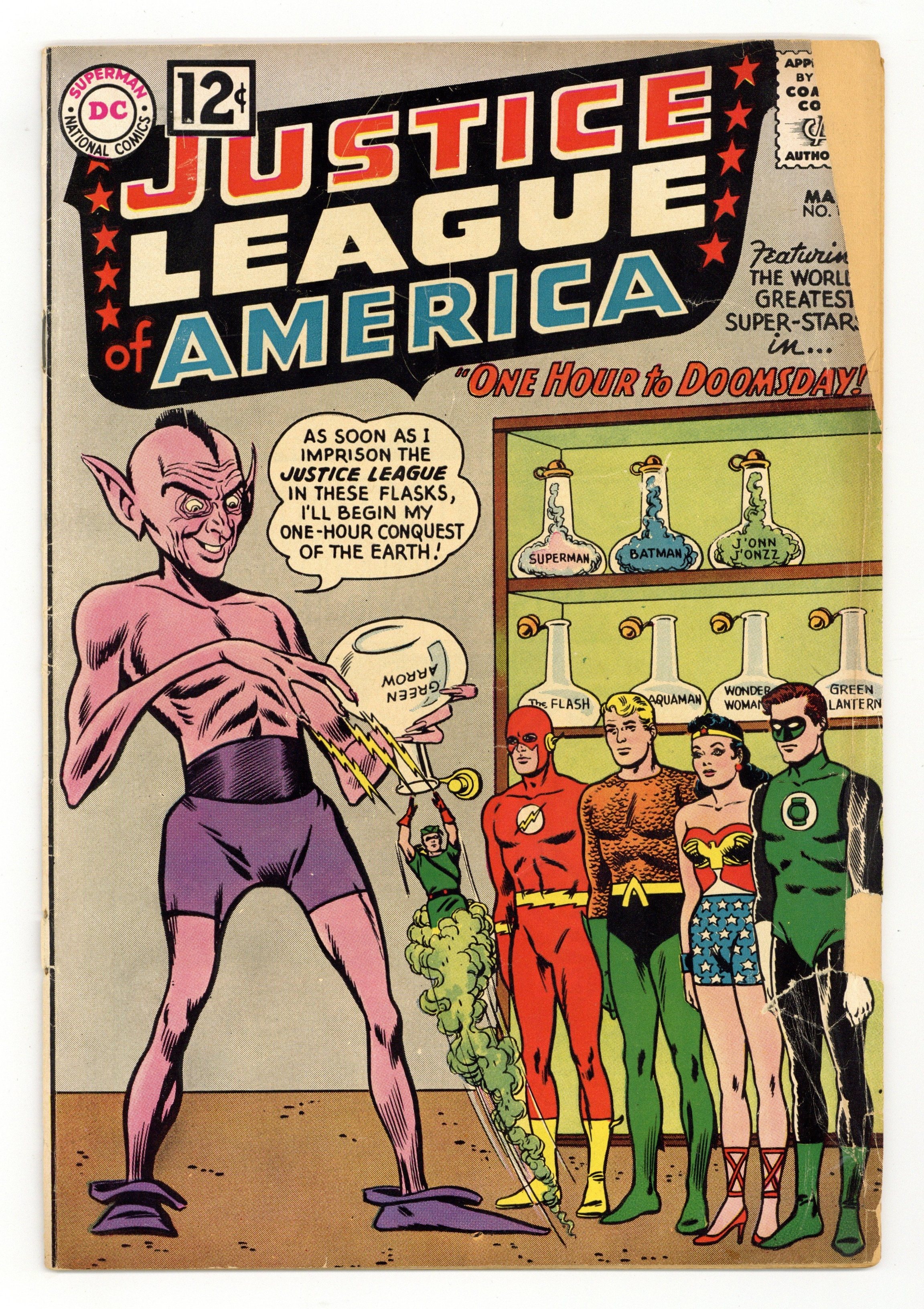 Ends Dec 8 8:42 PM CST Bid History 5 bids Current Bid $18 Your Secret Max Bid If you'd like to bid, please log in or register. Cover pencils by Mike Sekowsky, inks by Murphy Anderson. One Hour to Doomsday!, script by Gardner Fox, pencils by Mike Sekowsky, inks by Bernard Sachs; The League chases the Lord of Time into the future, but when they try to return, they find themselves unable to go anywhere earlier than 2062. Letter to the editor from E. Nelson Bridwell. 36 pgs. $0.12. Cover price $0.12.