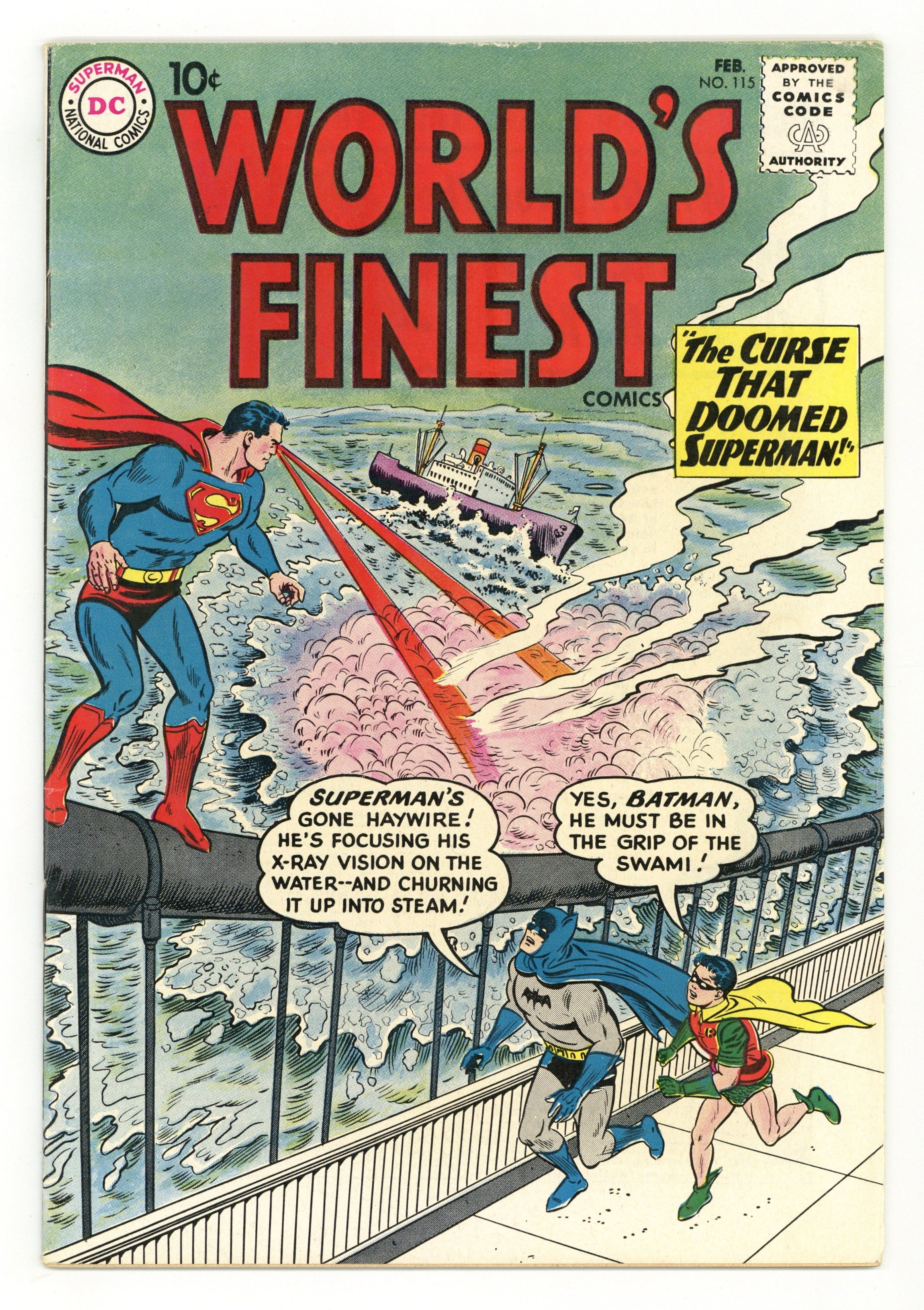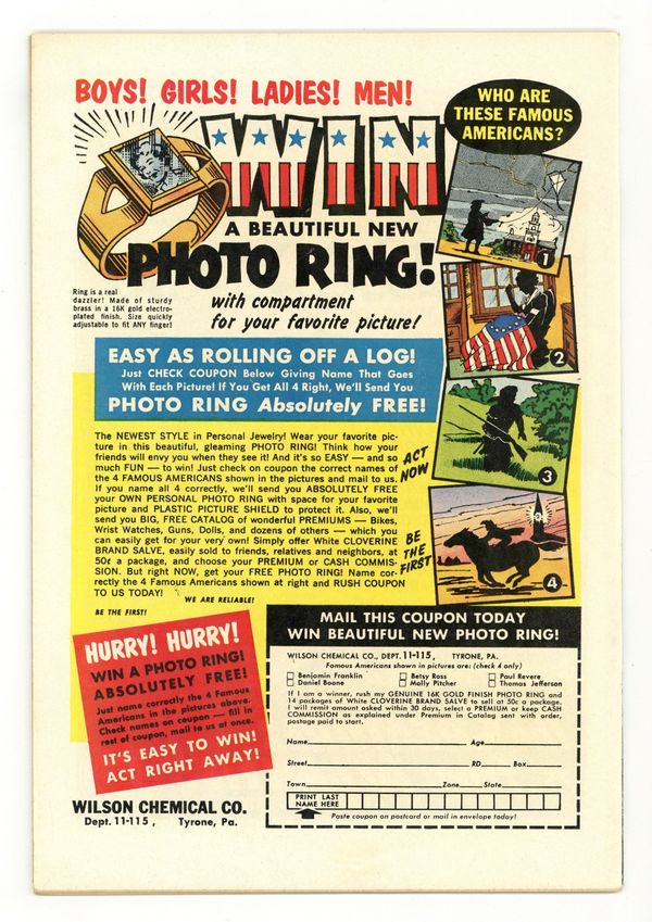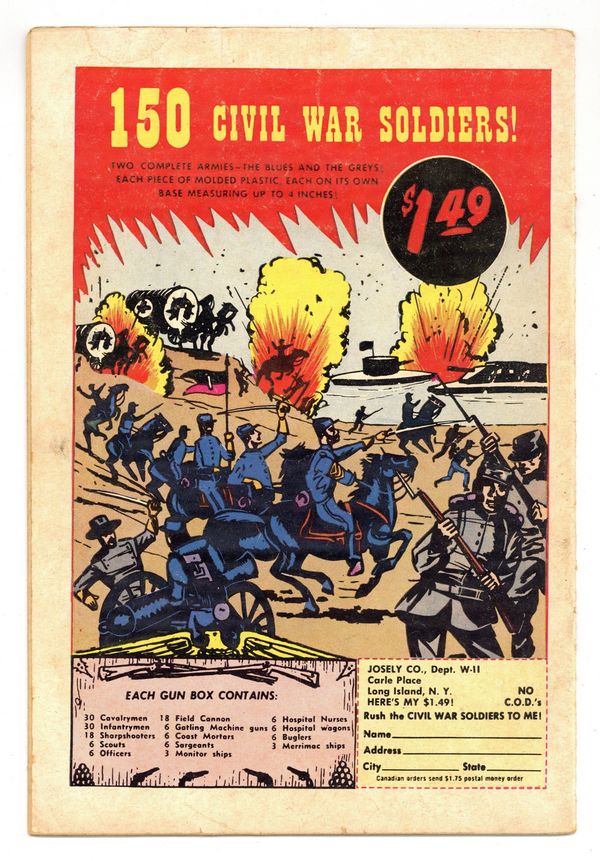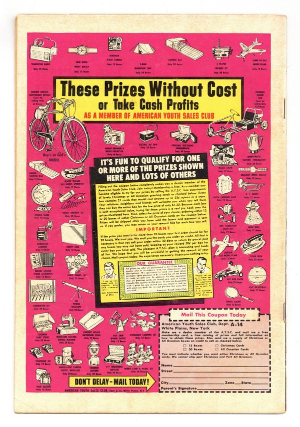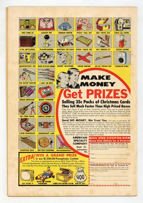 Ends Dec 8 10:12 PM CST Bid History 5 bids Current Bid $26 Your Secret Max Bid If you'd like to bid, please log in or register. Cover pencils by Curt Swan, inks by Sheldon Moldoff. The Curse That Doomed Superman starring Superman and Batman, script by Jerry Coleman, pencils by Dick Sprang, inks by Sheldon Moldoff; A Swami places a curse on Superman that he will follow every good deed with an evil deed. Our American Heritage public service announcement, script by Jack Schiff, art by Bernard Baily. A Trap for Tommy Tomorrow, art by Jim Mooney. Bebe humor page by Henry Boltinoff. The Mighty Arrow Army starring Green Arrow, art by Lee Elias; after Green Arrow and Speedy crash on their world tour in the small country of Luania they must help the local military against an invation by Dictator Bracato. 36 Pages, Full Color. Cover price $0.10.