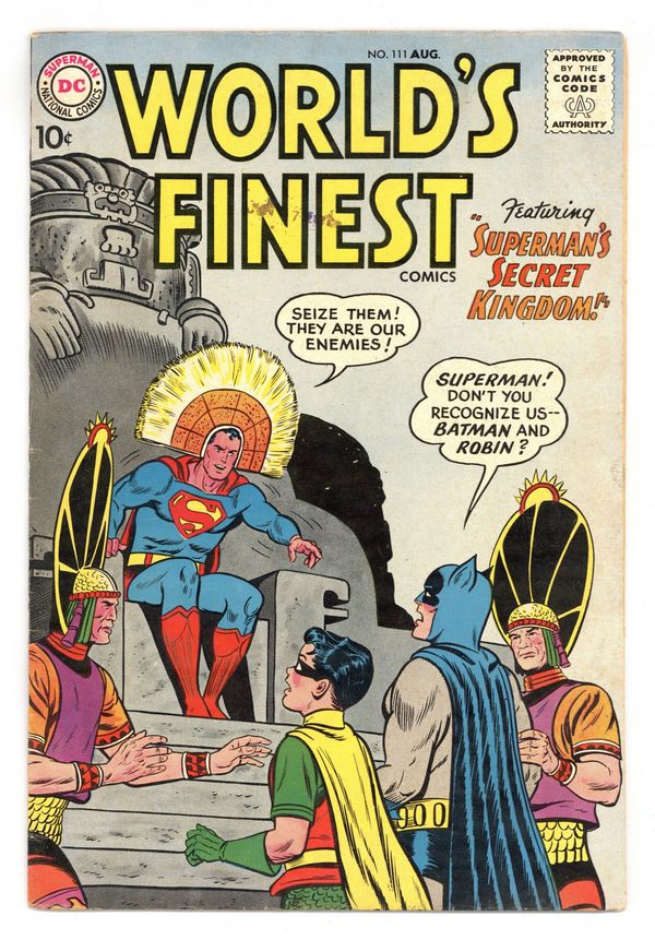 Starts Dec 8 Cover pencils by Curt Swan, inks by Sheldon Moldoff. Superman's Secret Kingdom starring Superman and Batman, script by Bill Finger, pencils by Dick Sprang, inks by Sheldon Moldoff; The force of a volcanic eruption gives Superman amnesia. He finds himself in a forgotten Aztec city and becomes the king of the inhabitants; When Batman and Robin go in search of him, they find the criminal Floyd Frisby who tries to convince Superman that Batman and Robin are really criminals. Ollie humor page by Henry Boltinoff. The Hermit of Titan starring Tommy Tomorrow, script by Jack Miller, art by Jim Mooney. Lend A Friendly Hand public service announcement starring Superman, script by Jack Schiff, pencils by Curt Swan, inks by Sheldon Moldoff. The Crimes of the Clock King starring Green Arrow, script by Ed Herron, art by Lee Elias; The Clock King is successful in a series of crimes, besting Green Arrow and Speedy. 36 Pages, Full Color. Cover price $0.10.
