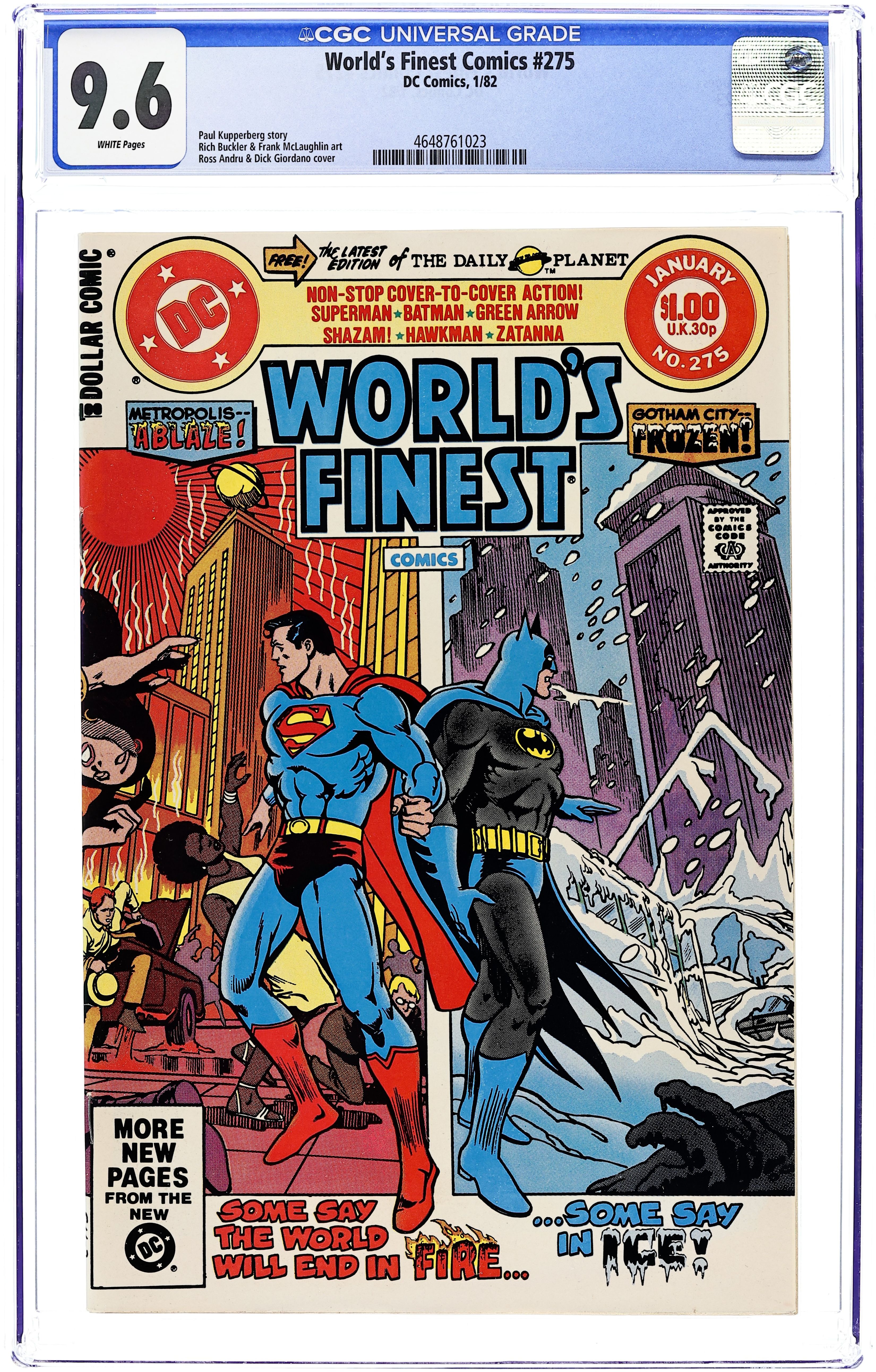 Starts Jan 3 Direct Edition. Cover pencils by Ross Andru, inks by Dick Giordano. Summer Days...Winter Nights starring Superman and Batman, script by Paul Kupperberg, pencils by Rich Buckler, inks by Frank McLaughlin; while Metropolis is undergoing a heatwave, Mr. Freeze tries to freeze Gotham City to make it livable for him. Archer In A Cage starring Green Arrow and Black Canary, script by Mike W. Barr, pencils by Trevor von Eeden, inks by Larry Mahlstedt. Soul Shriek starring Zatanna, script by Gerry Conway, art by Dan Spiegle. Matter, Matter, Everywhere starring Hawkman, script by Bob Rozakis, pencils by Alex Saviuk, inks by Rodin Rodriguez. The Snatching of Billy Batson starring Shazam!/Captain Marvel, script by E. Nelson Bridwell, pencils by Don Newton, inks by Dan Adkins. 52 Pages, Full Color. Cover price $1.00.