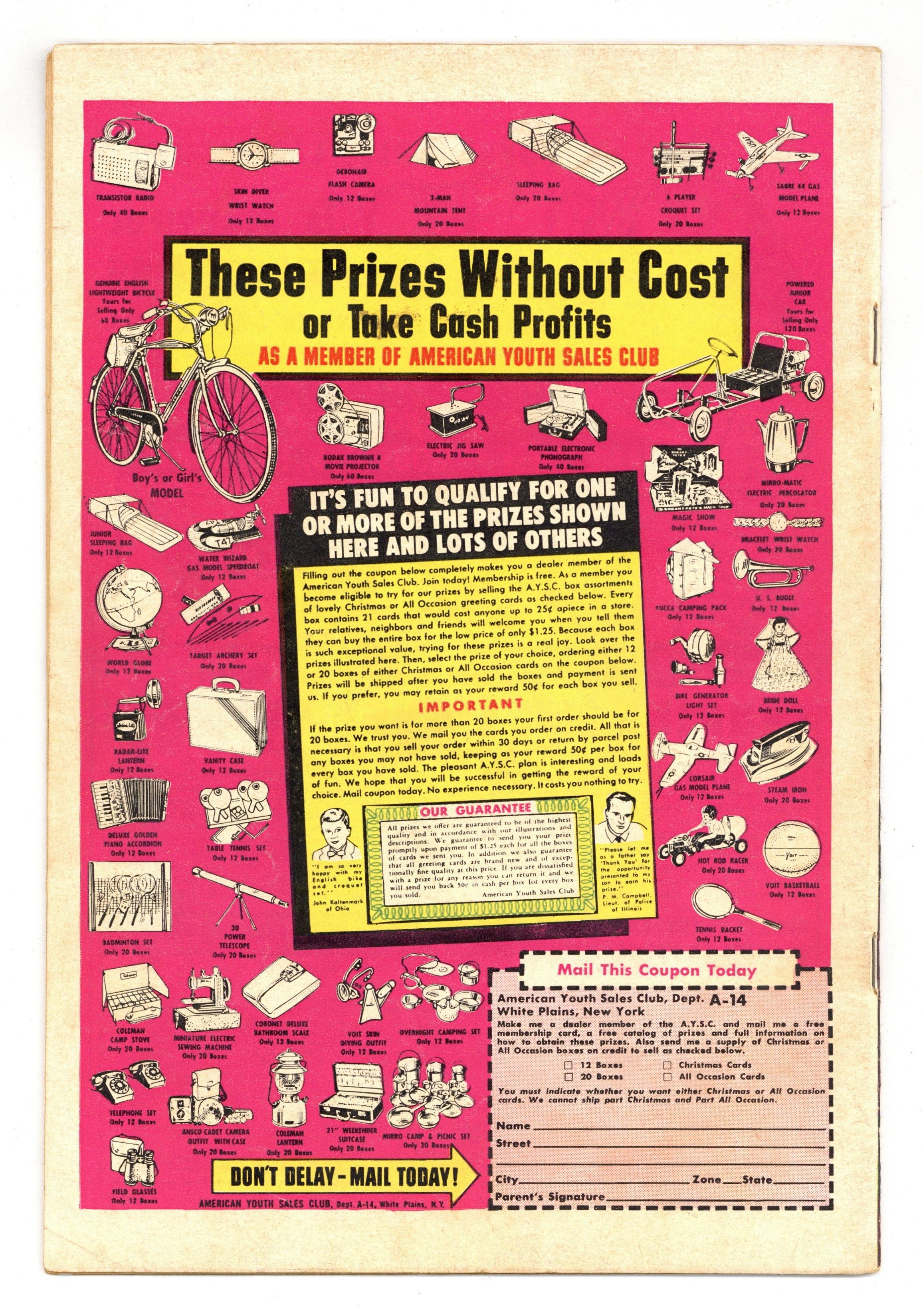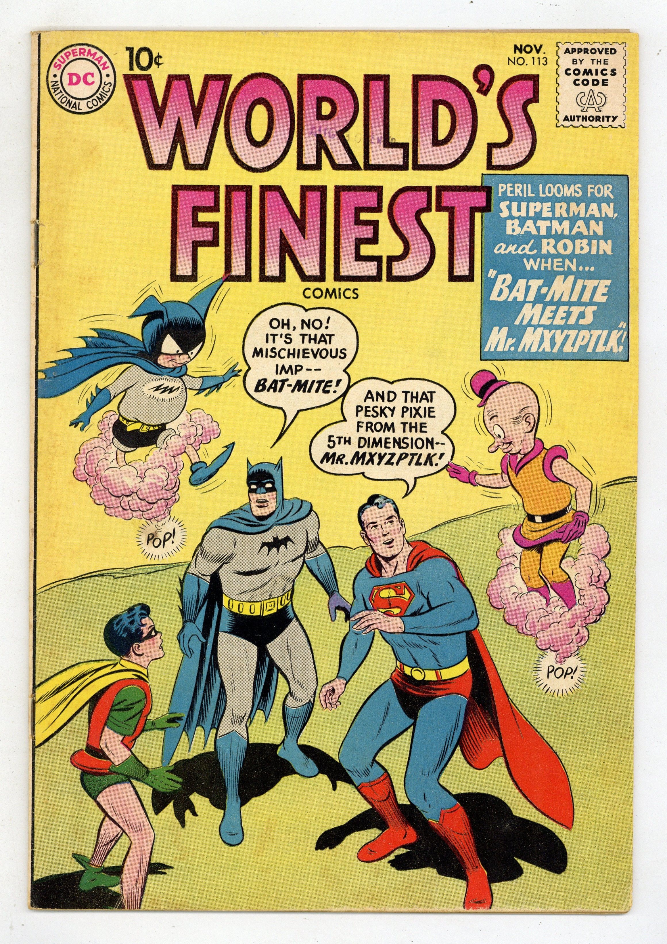 Starts Dec 8 Cover pencils by Curt Swan, inks by Stan Kaye. Bat-Mite Meets Mr. Mxyzptlk starring Superman and Batman, script by Jerry Coleman, pencils by Dick Sprang, inks by Sheldon Moldoff; Bat-Mite tries to stop Superman from helping Batman and Robin; Then Mr. Mxyzptlk decides that Bat-Mite should stop bugging Superman and a magic contest is begun between the two. Keep Learning -- the Key to Success! public service announcement, script by Jack Schiff, art by Bernard Baily. The Amazing Miss Arrowette, script by Dave Wood, art by Lee Elias; Miss Arrowette makes her debut by rescuing Green Arrow and Speedy from a gang of thieves. Dexter humor page by Henry Boltinoff. Journey to 1960 starring Tommy Tomorrow, script by Jack Miller, art by Jim Mooney. 36 Pages, Full Color. Cover price $0.10.