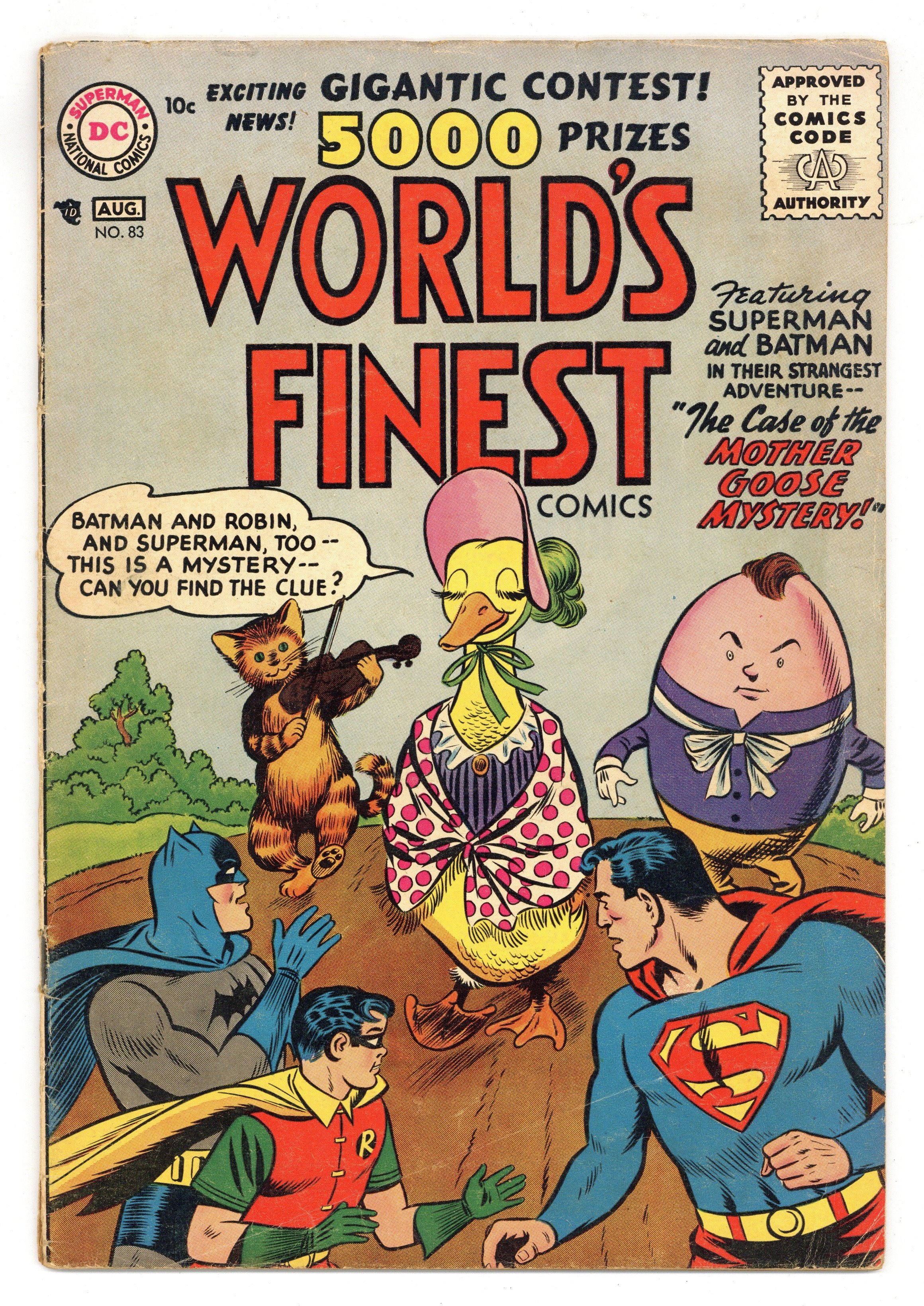 Starts Dec 8 Cover pencils by Dick Sprang, inks by Stan Kaye. The Case of the Mother Goose Mystery, script by Bill Finger, pencils by Dick Sprang, inks by Stan Kaye; Mystery Inc has set up a mystery for three high-paying clients so they can pretend to be Batman, Robin and Superman; A mix-up of dates causes the real superheroes to assume the parts that were to be played by the clients, and stop a real robbery in the process. Shorty humor page by Henry Boltinoff. The Error-Car, art by George Papp; Prof. Weldon Immelwimmer gives Green Arrow a super new arrow car that drives Oliver crazy. Man Overboard text story by Jack Miller [as Joe Maxwell]. The Tribe Without A Chief starring Tomahawk, art by Bob Brown. 36 Pages, Full Color. Cover price $0.10.
