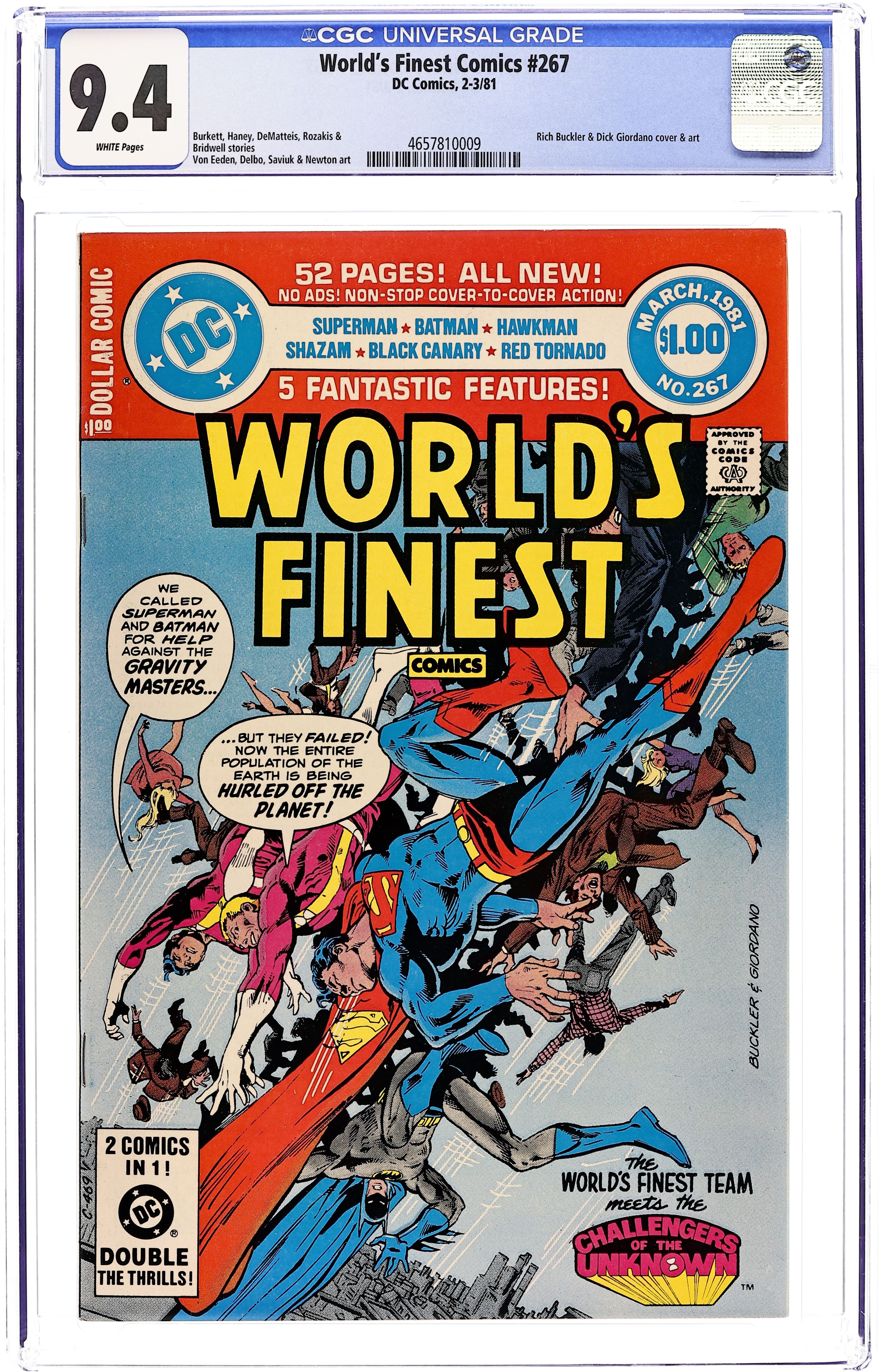 Starts Jan 19 52-page giant. The Challengers of the Unknown guest star in the Superman/Batman story, "When Strike the Gravity-Masters" (script by Cary Burkett, pencils by Rich Buckler, inks by Dick Giordano), Black Canary in "With This Gun I Thee Slay" (script by Bob Haney, pencils by Trevor Eeden, inks by Vince Colletta), Red Tornado in "Future Shock" (script by J.M. DeMatteis, pencils by Jose Delbo, inks by Kim DeMulder), Hawkman in "The Insect Invasion of Midway City" (script by Bob Rozakis, pencils Alex Saviuk, inks by Rodin Rodriguez), and Captain Marvel in "Assault of the Rock Eternity" (script by E. Nelson Bridwell, pencils by Don Newton, inks by Bob Smith). Comic strip by Fred Hembeck. Buckler cover pencils, Dick Giordano cover inks. 52 Pages, Full Color. Cover price $1.00.