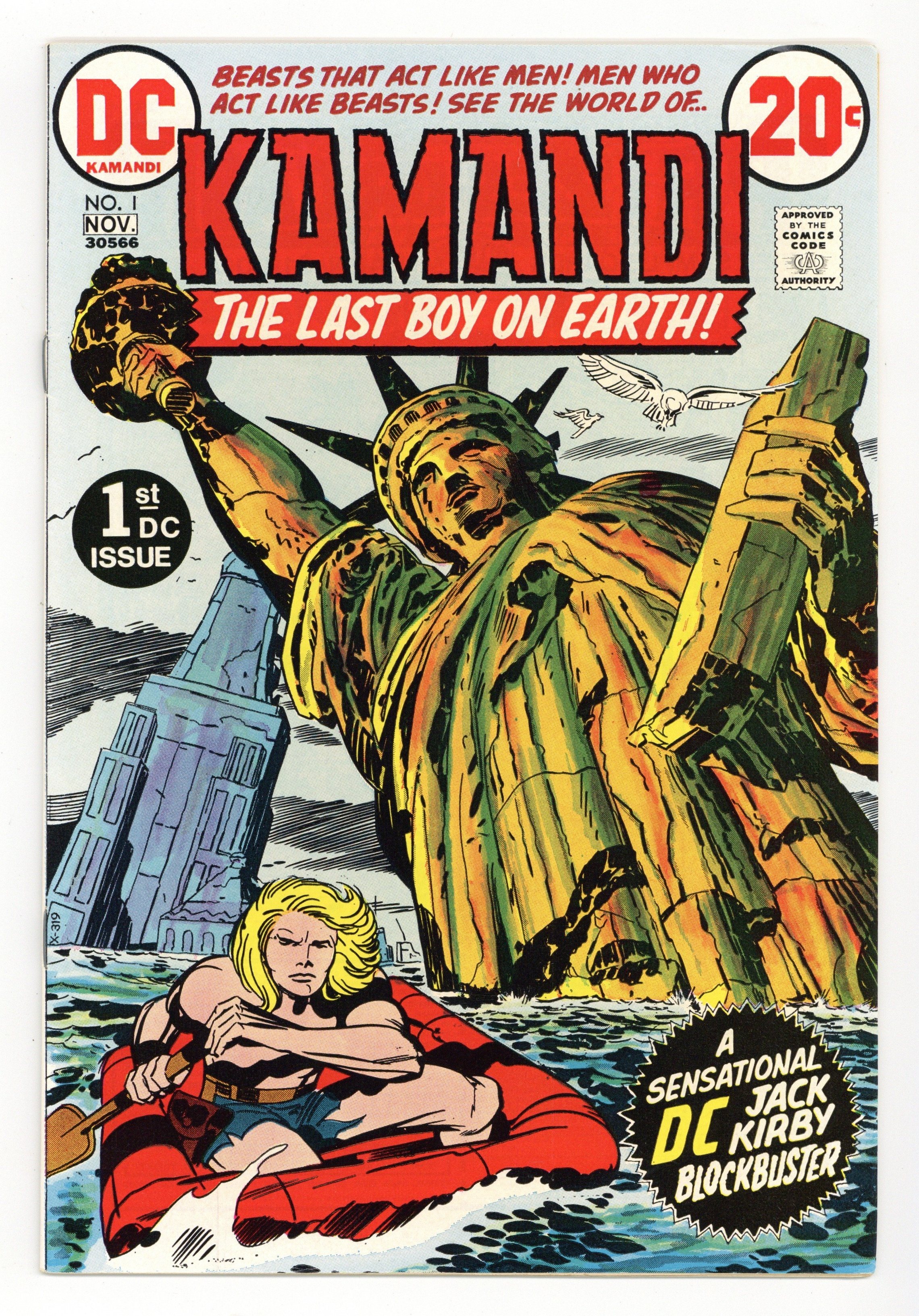 Starts Dec 15 1st appearance and origin of Kamandi. "The Last Boy on Earth." Script and pencils by Jack Kirby, inks by Mike Royer. Cover by Kirby and Royer. A series that borrows many concepts from Planet of the Apes, Kamandi takes place in an alternate future where animals have mutated into bipedal beings of intelligence and where humans are treated like savage beasts. Kamandi avenges the death of his grandfather, who was killed by wolves, but is then captured by a tiger named Caesar, who turns him over to dog-scientist Dr. Canus. Canus proceeds to help Kamandi, and this is where the so-called last boy on earth hooks up with Ben Boxer, a mutated human who can turn to living metal. Cover price $0.20.