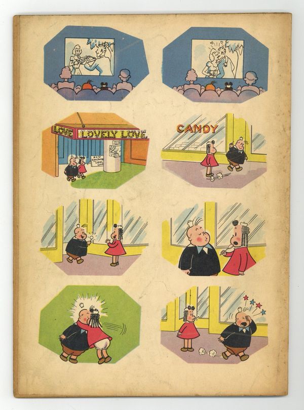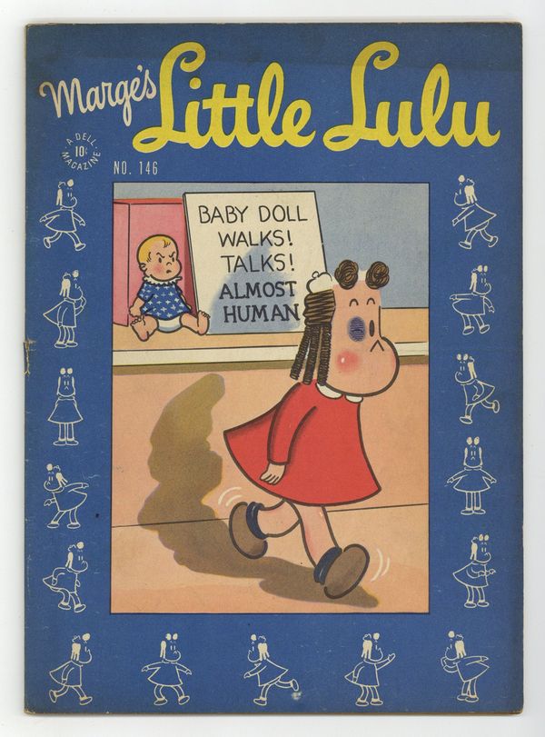 Starts May 11 Indicia title is "MARGE'S LITTLE LULU, No. 146." The Kid Who Came to Dinner; Tubby invites himself to dinner at Lulu's house. Sunday Afternoon; Lulu and Tubby go to a meadow to pick flowers for her mother. Forbidden Fruit; Lulu and Tubby try to pick an apple from a tree on Ol' Man Gripe's lawn. Rainy Day; On a rainy day, Lulu's and Tubby's mothers send them to the train station with umbrellas so that their fathers won't have to walk home in the rain. Crybaby; Lulu tells Alvin a story about a time long ago when she cried all the time. 52 pages, full color. Cover price $0.10.