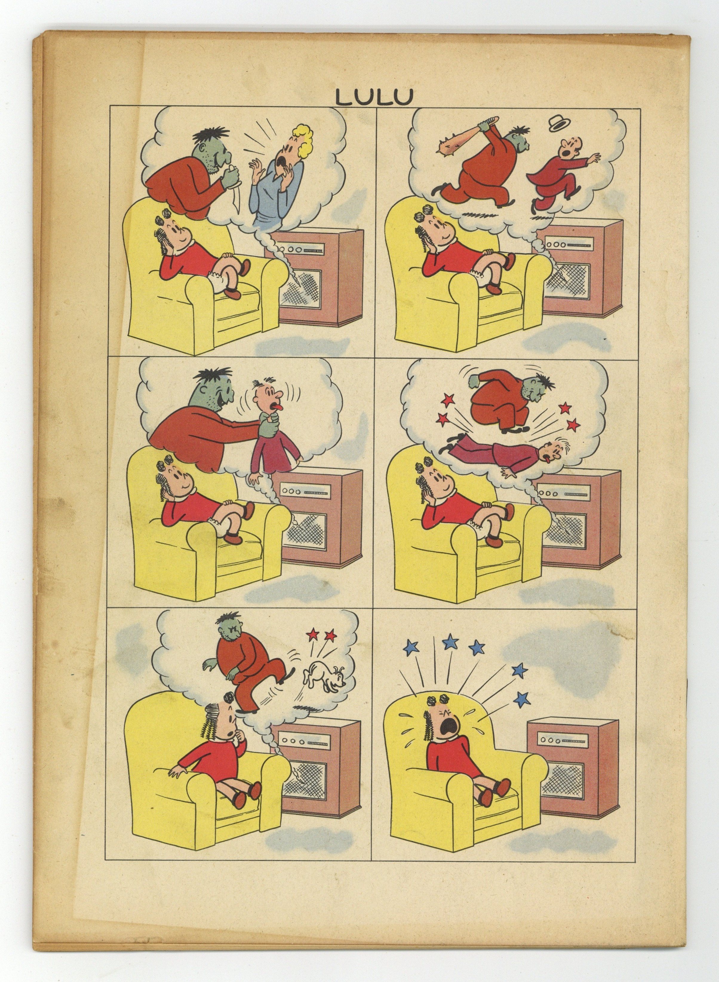 Starts May 11 "MARGE'S LITTLE LULU, No. 165." Cover art by John Stanley. Weight and Fortune Machine; Lulu gets a card from a weight and fortune machine. The Case of the Purloined Popover; Lulu is spanked by her mother, who thinks she stole some popovers from the kitchen. Alvin's Solo Flight; Lulu and Tubby go to the beach, but have to take Alvin along with them. Never Again; Lulu borrows her father's pipe, smokes some doll hair, and has hallucinations. Scripts and art by John Stanley. 52 pages, full color. Cover price $0.10.