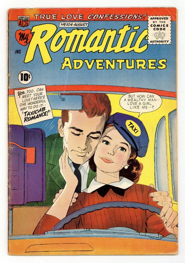 Starts May 11 Cover by Ken Bald. Edited by Richard E. Hughes. Stories by Richard Hughes. Art by John Forte, Kenneth Landau, John Rosenberger and Ogden Whitney. Tales of romance from legendary early independent comics publisher ACG. Another rich-meets-poor love story, only this time the struggling taxi driver with a wealthy amour is a woman. A doctoral candidate learns a lot when she studies the dating habits of college men. Advice on men and money. Taxicab Romance; Love? Who Cares?; Doctor of Dates; Of Men and Money; Iris Grows Up; The Pessimist; The Other Woman. 32 pages, Full Color. Cover price $0.10.