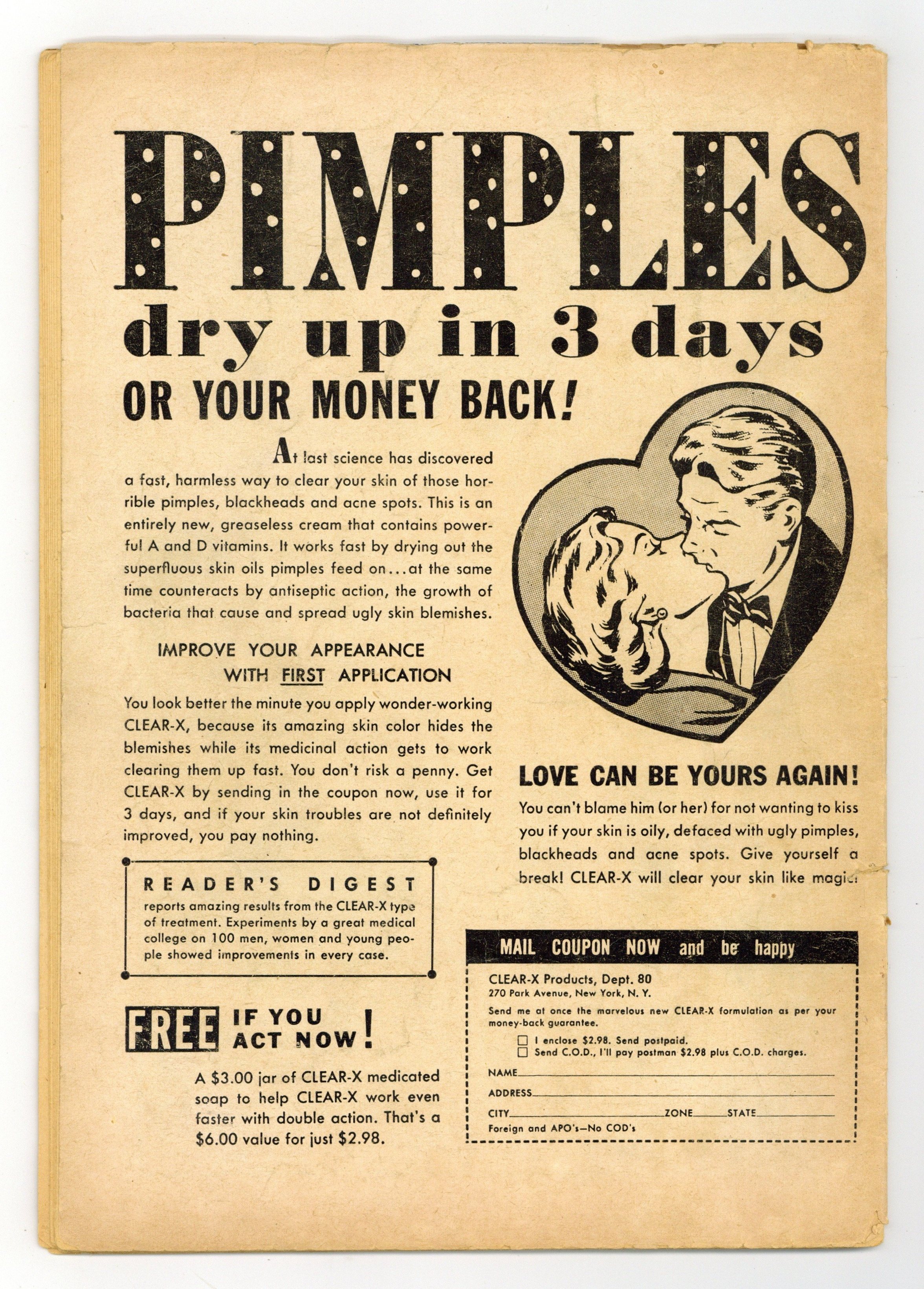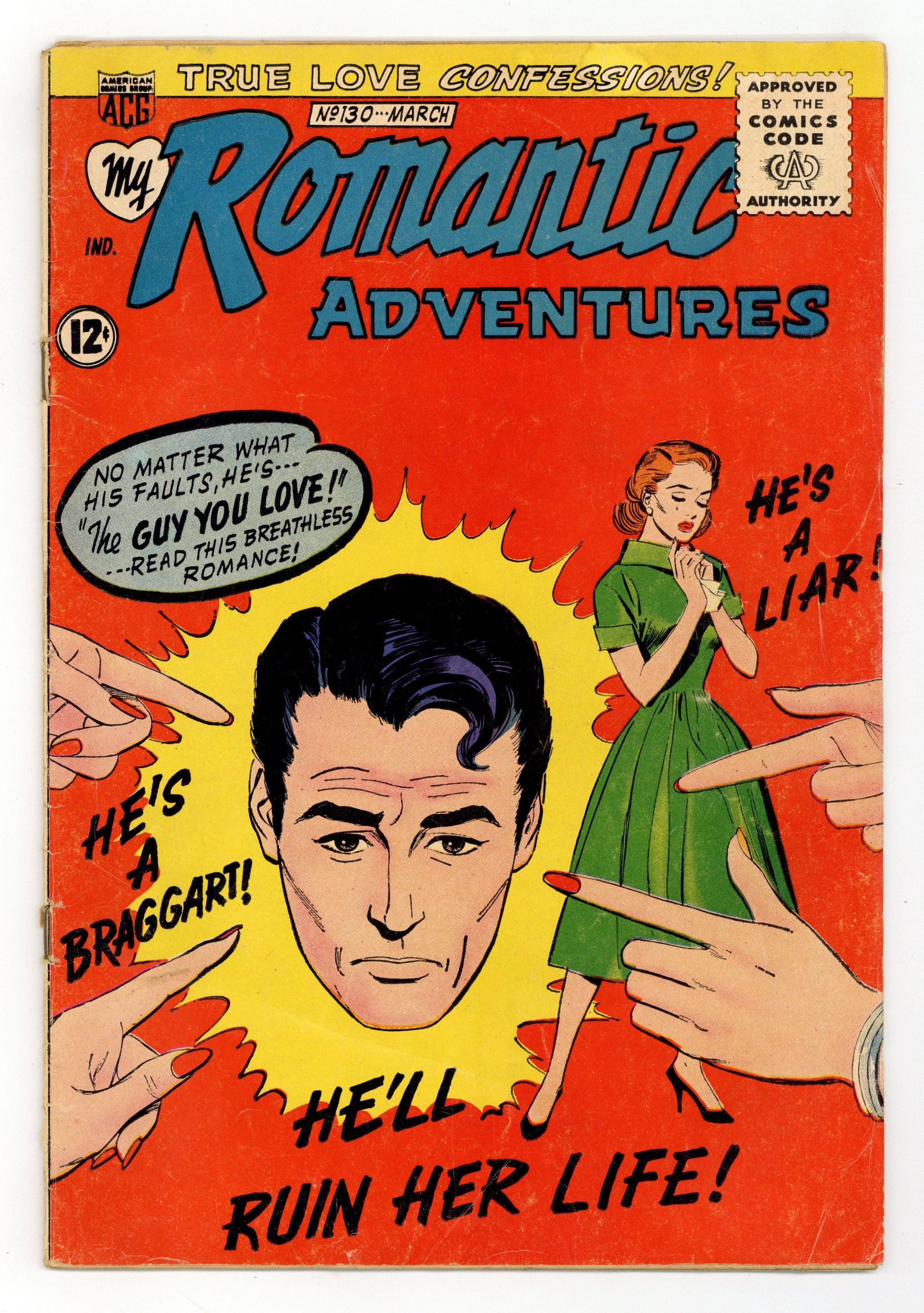 Starts May 11 Cover by Ken Bald. Edited by Richard E. Hughes. Stories by Richard Hughes. Art by Pete Costanza, John Rosenberger and Ogden Whitney. Tales of romance from legendary early independent comics publisher ACG. A gal determines to stick with her guy, despite everyone pointing out his many faults; A man tries to win over a woman who hates him; Advice on making a good impression, and keeping your courage in anxious situations. Cover is reused, with new color and text, from Confessions of the Lovelorn #94. The Guy You Love!; Peaches and Cream; Get Back in Circulation; Make a Good Impression!; Supermarket Sweetheart; You Need Nerve!; Man of My Dreams; The Girl Who Hated Me! 32 pages, Full Color. Cover price $0.12.