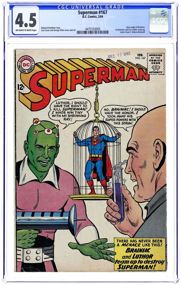 Starts Dec 8 Cover pencils by Curt Swan, inks by George Klein. The Deadly Duo! [The Team of Luthor and Brainiac! part 1], script by Edmond Hamilton and Cary Bates (plot), pencils by Curt Swan, inks by George Klein; Lex Luthor escapes prison and discovers the existence of Brainiac. The Downfall of Superman! [The Team of Luthor and Brainiac! part 2]; Lex Luthor releases Brainiac from prison, re-programs him, and teams with him to shrink Superman; 1st appearance of Tharla, Lex Luthor's future wife. The Hour of Kandor's Vengeance! [The Team of Luthor and Brainiac! part 3]; With the help of the Kandorians, Superman turns the tables on Luthor and Brainiac. Letter to the editor from comics writer E. Nelson Bridwell. 36 Pages, Full Color. Cover price $0.12.