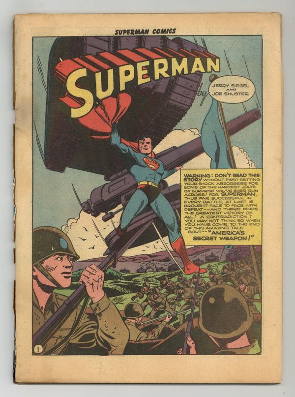 Starts Jan 3 Cover art by Jack Burnley. America's Secret Weapon!, script by Don Cameron [as Jerry Siegel], pencils by Sam Citron [as Joe Shuster], inks by Sam Citron [as Joe Shuster]; When Superman arrives at Camp Towne to make an appearance, he volunteers to participate in the war games that will take place. A Claw For a Clue text story by Tex Raines. Habitual Homicide, script by Jerry Siegel, art by George Roussos [as Joe Shuster]; When Professor Lock makes a move on one of the college girls and is rebuffed, he swears revenge by killing the college dean and blaming her fiance. Hank the Yank humor page by Ray Houlihan. Fashions In Crime starring Superman, script by Jerry Siegel, art by Peter Riss [as Joe Shuster]. Clancy the Cop humor page by Henry Boltinoff. Danger On the Diamond starring Superman, script by Jerry Siegel, art by John Sikela [as Joe Shuster]. 60 Pages, Full Color. Cover price $0.10.
