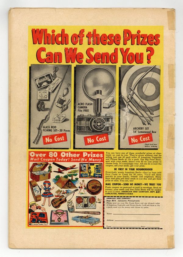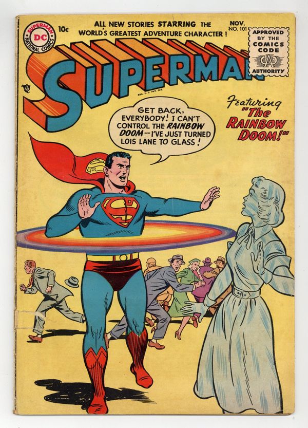 Starts Dec 8 Cover art by Al Plastino. Luthor's Amazing Rebus starring Superman and Lex Luthor, pencils by Wayne Boring, inks by Stan Kaye. The Meek Man's Club starring Superman, art by Al Plastino. The Rainbow Doom, art by Al Plastino; Superman accidentally turns Lois Lane into glass. 36 Pages, Full Color. Cover price $0.10.