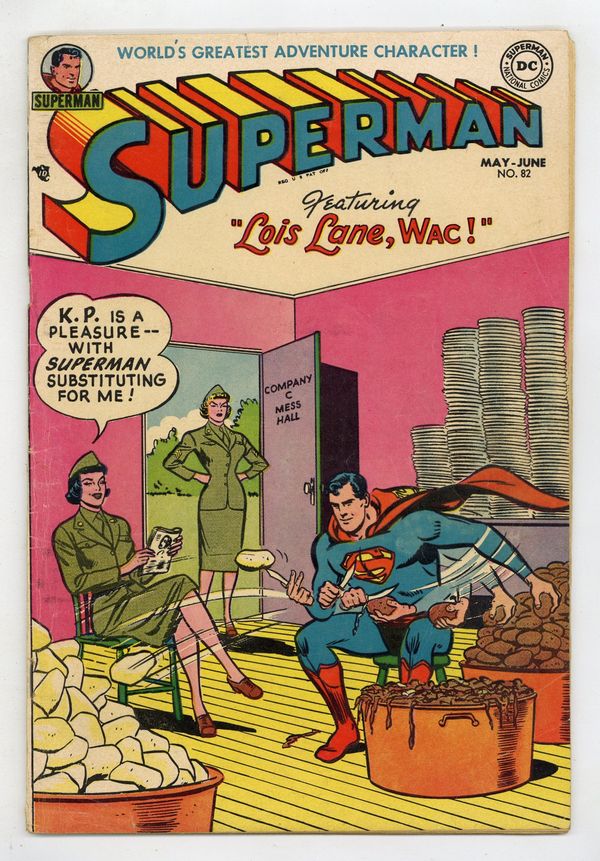 Starts Jan 3 Cover art by Win Mortimer. Lois Lane Joins the WACs! starring Superman, Lois Lane, Sgt. Gloria Mulvaney, Perry White, and Judy Masters, script by Bill Woolfolk, pencils by Wayne Boring, inks by Stan Kaye. Jerry Jitterbug humor two-pager by Henry Boltinoff. The Unemployed Superman starring Superman, Mr. Mxyztplk, Lois Lane, and Perry White, art by Al Plastino. The Hurricane Hunters text article by John Marlowe. The Super-Reporter of Metropolis starring Superman, script by Bill Woolfolk, art by Al Plastino; Superman single-handedly puts out an issue of the Dailey Planet. 44 Pages, Full Color. Cover price $0.10.