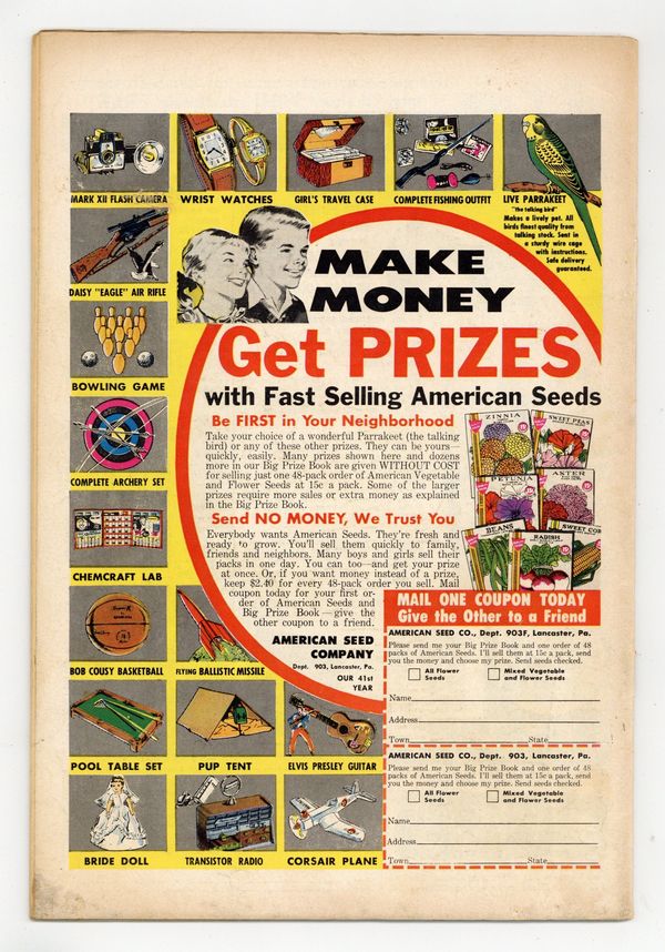 Starts Dec 15 Cover pencils by Wayne Boring, inks by Stan Kaye. Lois Lane, Super-Genius starring Superman, art by Wayne Boring. Clark Kent, Jailbird starring Superman and Ed Rowse, art by Al Plastino. The Super-Family From Outer Space starring Superman and Vitor Vall, pencils by Wayne Boring, inks by Stan Kaye; a family visits Earth to see Clark/Superman. Full-page full-color interior ad for Showcase # 1 featuring the "Fire Fighters." Fearless Fosdick stars in a quarter-page Wildroot Cream-Oil ad with art by Al Capp. 36 Pages, Full Color. Cover price $0.10.