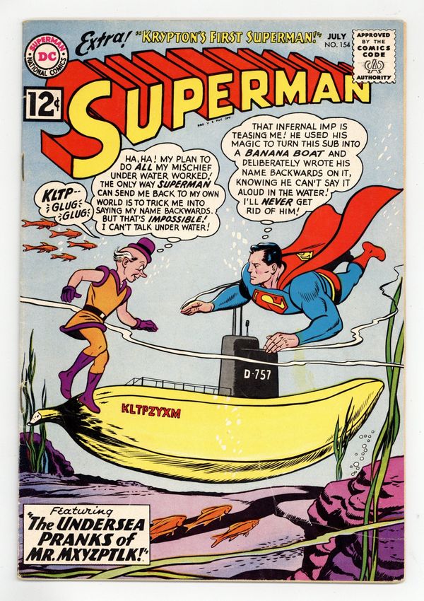 Starts Dec 15 Cover pencils by Curt Swan, inks by George Klein. The Underwater Pranks of Mr. Mxyzptlk!, script by Edmond Hamilton, pencils by Curt Swan, inks by George Klein; Mr. Mxyzptlk returns to the 3rd dimension to attempt to win a practical joke contest in his home dimension. Krypton's First Superman! starring Lori Lemaris, script by Jerry Siegel, pencils by Curt Swan, inks by George Klein; Supergirl discovers why Superman has begun to act evil at random intervals, and it all goes back to before Krypton exploded. Superman is also featured in a one-page public service announcement, Be a Good Citizen. 36 Pages, Full Color. Cover price $0.12.