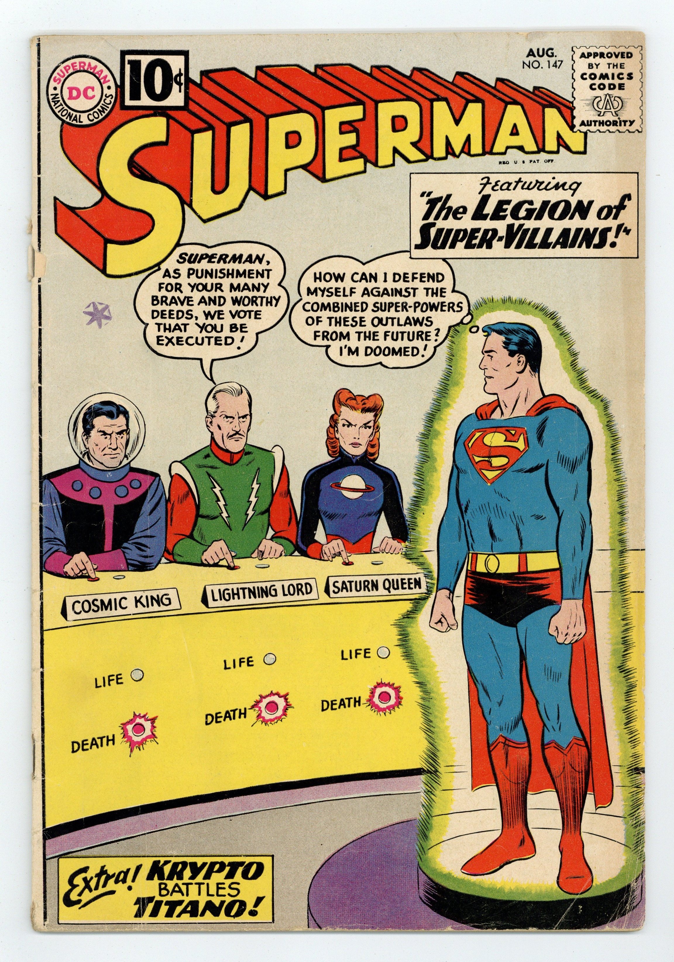Starts Jan 19 7th appearance of of the Legion of Super-Heroes and 1st appearances of the Legion of Super-Villains and the Adult Legion. Cover pencils by Curt Swan, inks by Sheldon Moldoff. The Great Mento!, art by Al Plastino; Perry White fakes ESP powers as The Great Mento (with Superman's help) to capture wanted criminals. Krypto Battles Titano!, art by Al Plastino; Krypto travels into the prehistoric past to meet Titano. The Legion of Super-Villains!, script by Jerry Siegel, pencils by Curt Swan, inks by Sheldon Moldoff; Luthor contacts and teams up with Legion of Super-Villains from 30th Century; adult Legion of Super-Heroes comes to 20th Century to help Superman. 36 Pages, Full Color. Cover price $0.10.