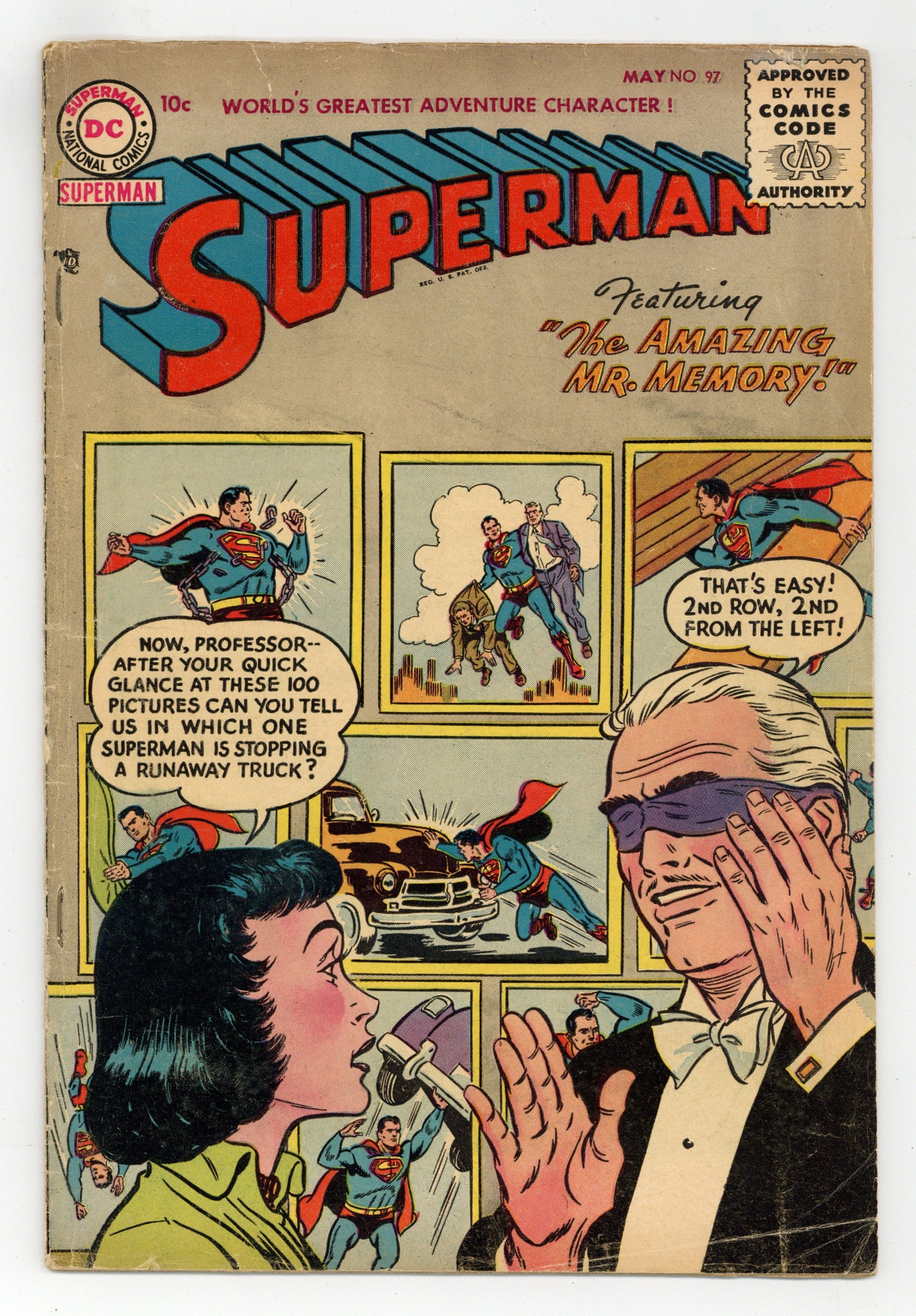Starts Jan 3 Cover art by Al Plastino. The Amazing Professor Memory, script by Bill Finger, art by Al Plastino; Superman takes the place of Professor Memory when the mob is after him for accidentally learning the serial numbers on some stolen bills. Varsity Vic humor page by Henry Boltinoff. The Big Game Hunt of Metropolis, script by Otto Binder, pencils by Curt Swan, inks by Ray Burnley; The Swindle Syndicate dupe Jimmy Olsen with free passes to Jack Borden's Big Game Hunt in an attempt to stop Clark Kent from figuring out who their leader is. Superboy's Last Day in Smallville!, script by Jerry Coleman, pencils by Wayne Boring, inks by Stan Kaye. Fearless Fosdick stars in a quarter-page Wildroot Cream-Oil ad with art by Al Capp. 36 Pages, Full Color. Cover price $0.10.