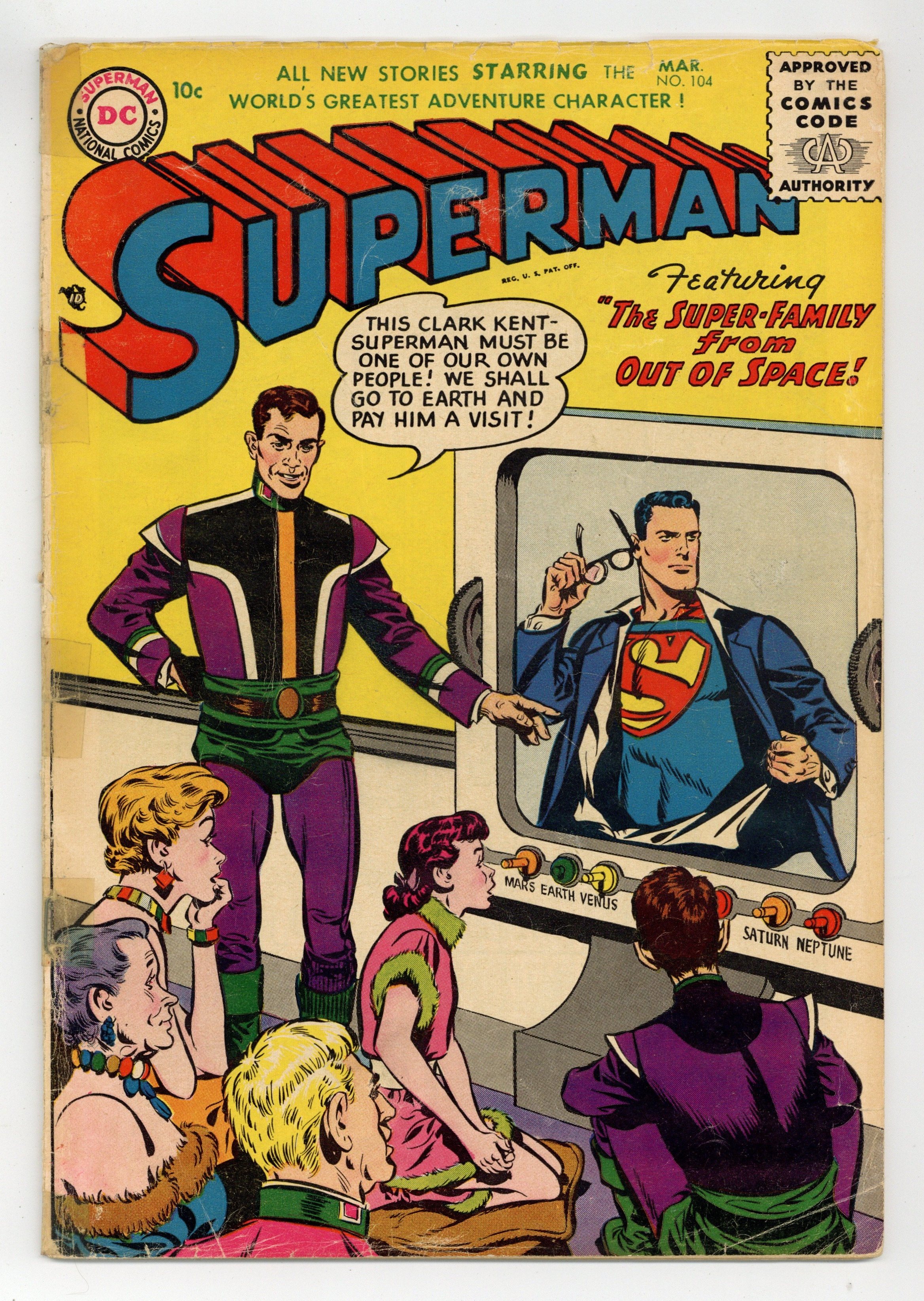 Starts Jan 3 Cover art by Win Mortimer. Hank Garvin, Man of Steel starring Superman, Hank Garvin, Honest Jack Dugan, Friendly Al Piper, and Harry Dane, script by Bill Finger. The Mighty Mite starring Superman, Jonathan Kent, Martha Kent, Jeremy Kendall, Henrietta Kendall, Horace Preson, and Cynthia Preston, script by Bill Finger, pencils by Wayne Boring, inks by Stan Kaye. Jerry Jitterbug humor two-pager by Henry Boltinoff. Boxing's Forgotten Man text story by Frank Minton. Perry White Vs. Clark Kent, pencils by Curt Swan, inks by John Fischetti; Clark Kent briefly becomes Planet editor; Planet combines with rival Dispatch. Superman is also featured in a one-page public service announcement, "The World is Our Schoolroom! 52 Pages, Full Color. Cover price $0.10.