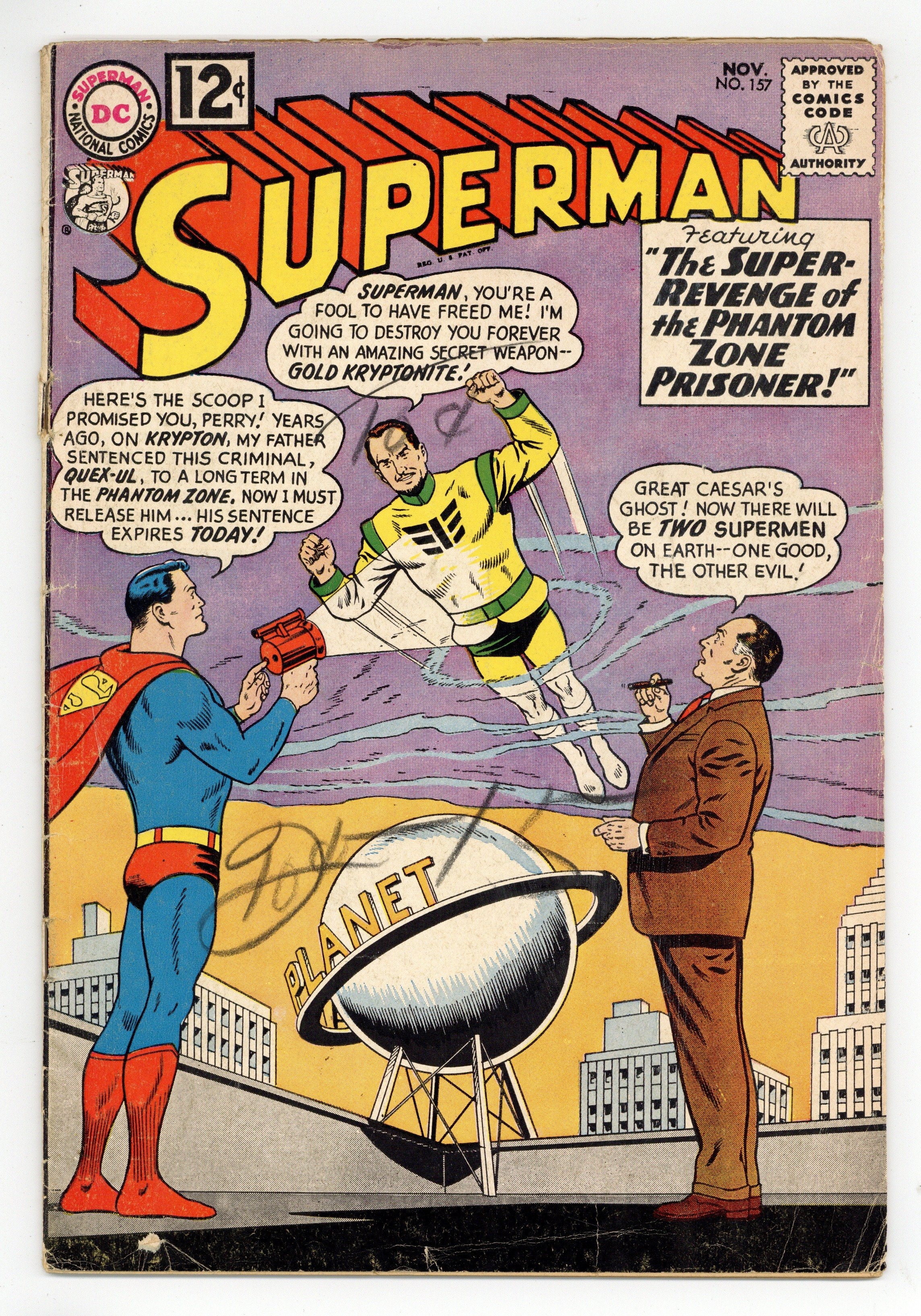 Starts Dec 15 Cover pencils by Curt Swan, inks by George Klein. The Super-Revenge of the Phantom Zone Prisoner!, script by Ed Hamilton, pencils by Curt Swan, inks by George Klein; Superman releases Quex-Ul from the Phantom Zone since he has served his sentence, but Quex-Ul vows revenge on the son of the man who pronounced him guilty. The Super-Genie of Metropolis! starring Superman and Lori Lemaris, script by Robert Bernstein, art by Al Plastino. Superman's Day of Doom! starring the Legion of Super-Heroes, script by Jerry Siegel, pencils by Curt Swan, inks by George Klein. 36 Pages, Full Color. Cover price $0.12.