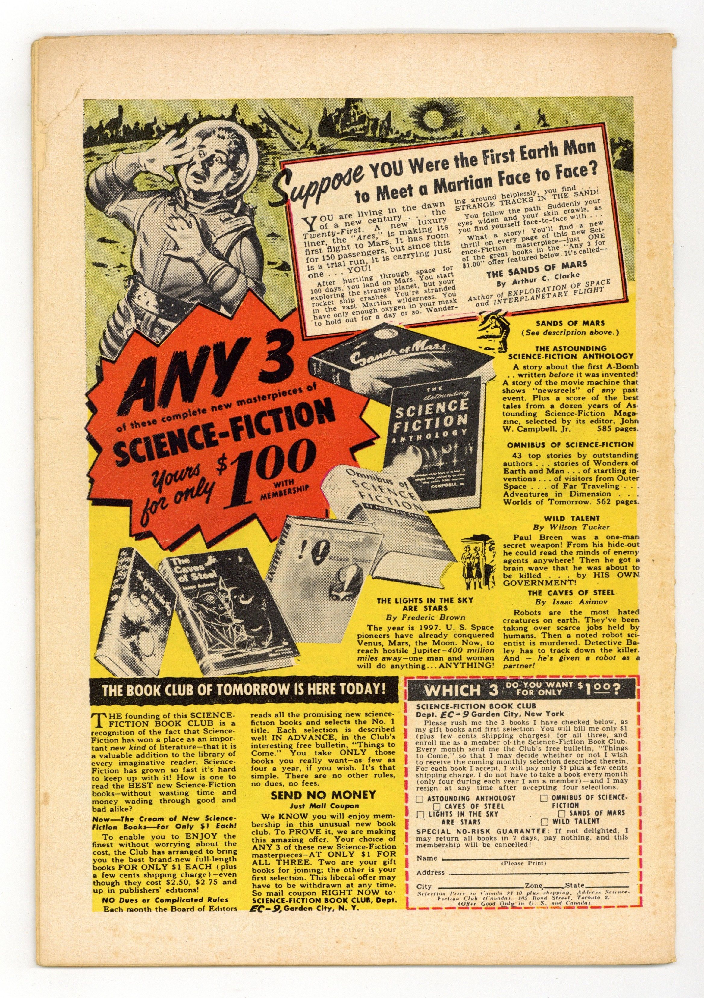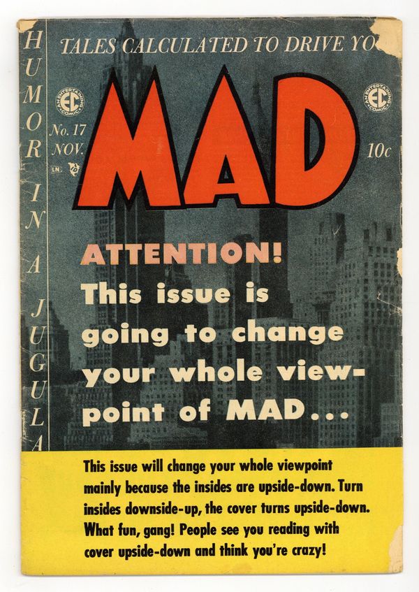 Starts Dec 15 Humor magazine with this issues' contents printed upside down. The cover says "Turn insides downside-up, the cover turns upside-down. What fun, gang! People see you reading with the cover upside-down and think you're crazy!" Ad for Panic magazine. "Bringing Back Father!", art by Bill Elder and Bernie Krigstein; Jiggie cannot take Maggs's abuse any longer so when he has his serious moments he hires some goons to beat her into submission. "What's My Shine!", art by Jack Davis; How the Senate Subcomittee hearings would go if they were run like a TV game show; Loosely based on "What's My Line?" Ad for Piracy magazine. "Meet Miss Potgold," art by Basil Wolverton; A collection of drawings of grotesque women entered in the Miss Potgold of 1955 contest. "Julius Caesar!", art by Wally Wood; MAD writer points out standard lampoon shtick elements during a portion of Julius Caesar story. 36 pgs., full color. $0.10. Cover price $0.10.