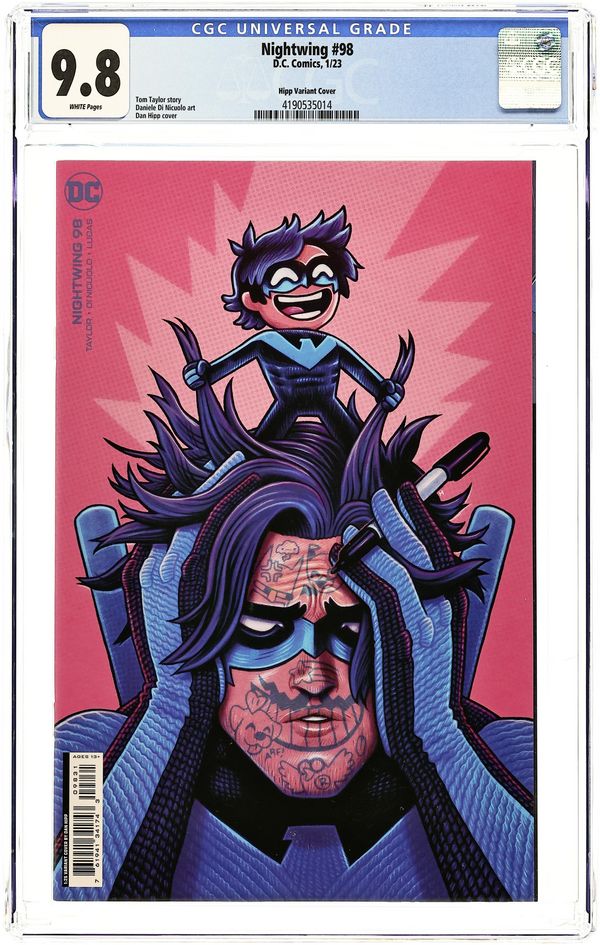 Starts Dec 8 Limited 1 for 25 Retailer Incentive Variant Cover. Written by Tom Taylor. Art by Daniele Di Nicuolo. Cover by Dan Hipp. Nightwing meets Nite-Mite! (And Bitewing and Oracle and Daniele Di Nicuolo!) That's right, that meddling Nite-Mite booped himself from the fifth dimension, and after reading Seven Secrets, he hitchhiked his way over with Di Nicuolo into our Nightwing series! Trust us, you're not going to want to miss this one. 32 pages, full color. Rated teen Cover price $4.99.