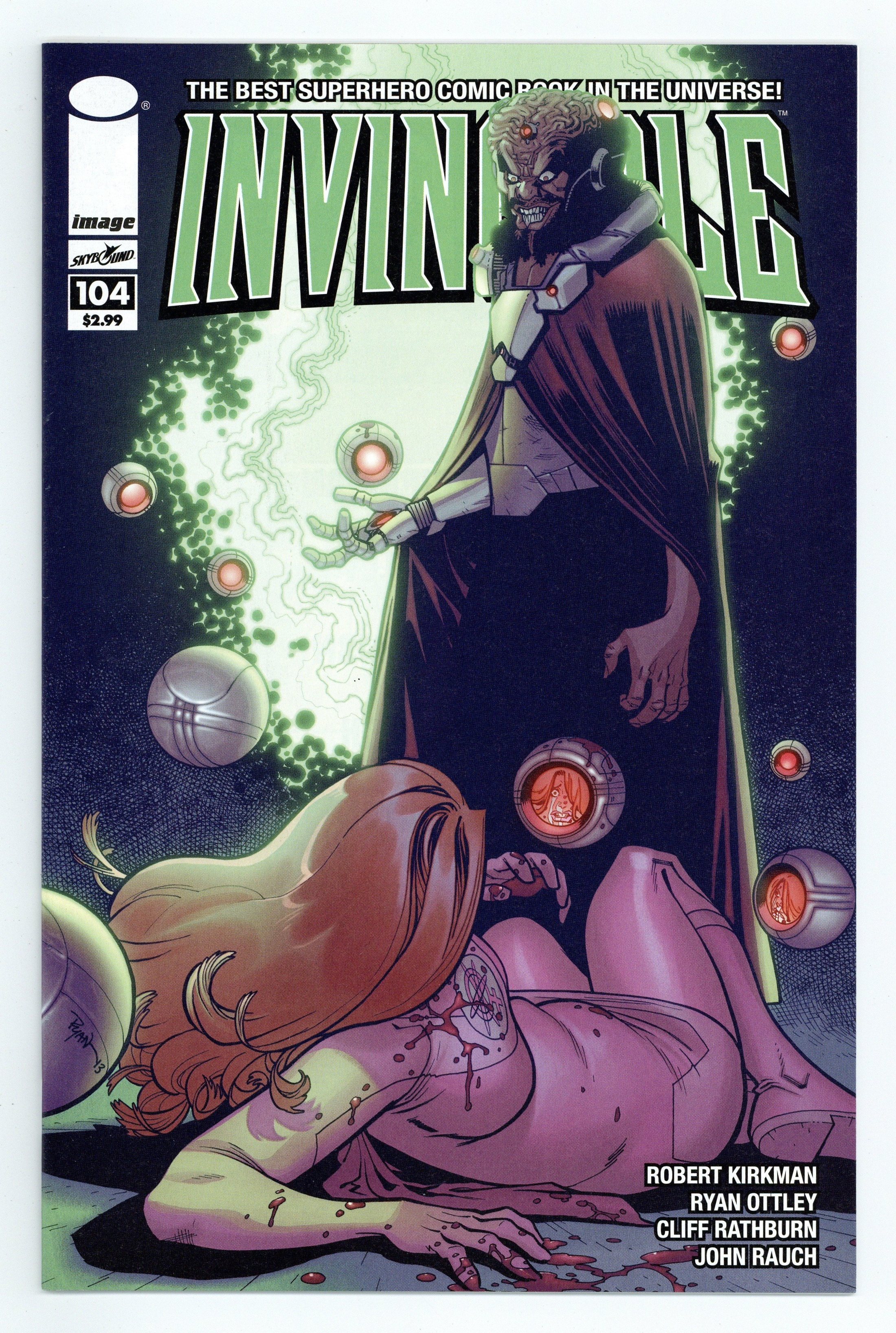 Written by ROBERT KIRKMAN. art by RYAN OTTLEY. cover by RYAN OTTLEY & BILL CRABTREE. CONCEPT: Mark Grayson is just like everyone else his age, except that his father is the most powerful superhero on the planet. And now he's begun to inherit his father's powers. It all sounds okay at first, but how do you follow in your father's footsteps when you know you will never live up to his standards? THIS ISSUE: Machine Head was the king of the super-villain underworld for years. Nothing could stop him: He was untouchable. Now, with the help of villain-turned-hero Titan, Invincible is almost single-handedly taking down the most powerful crime boss the world has ever seen, but he's got to get through a legion of super-powered cronies first. Cover price $2.95. -