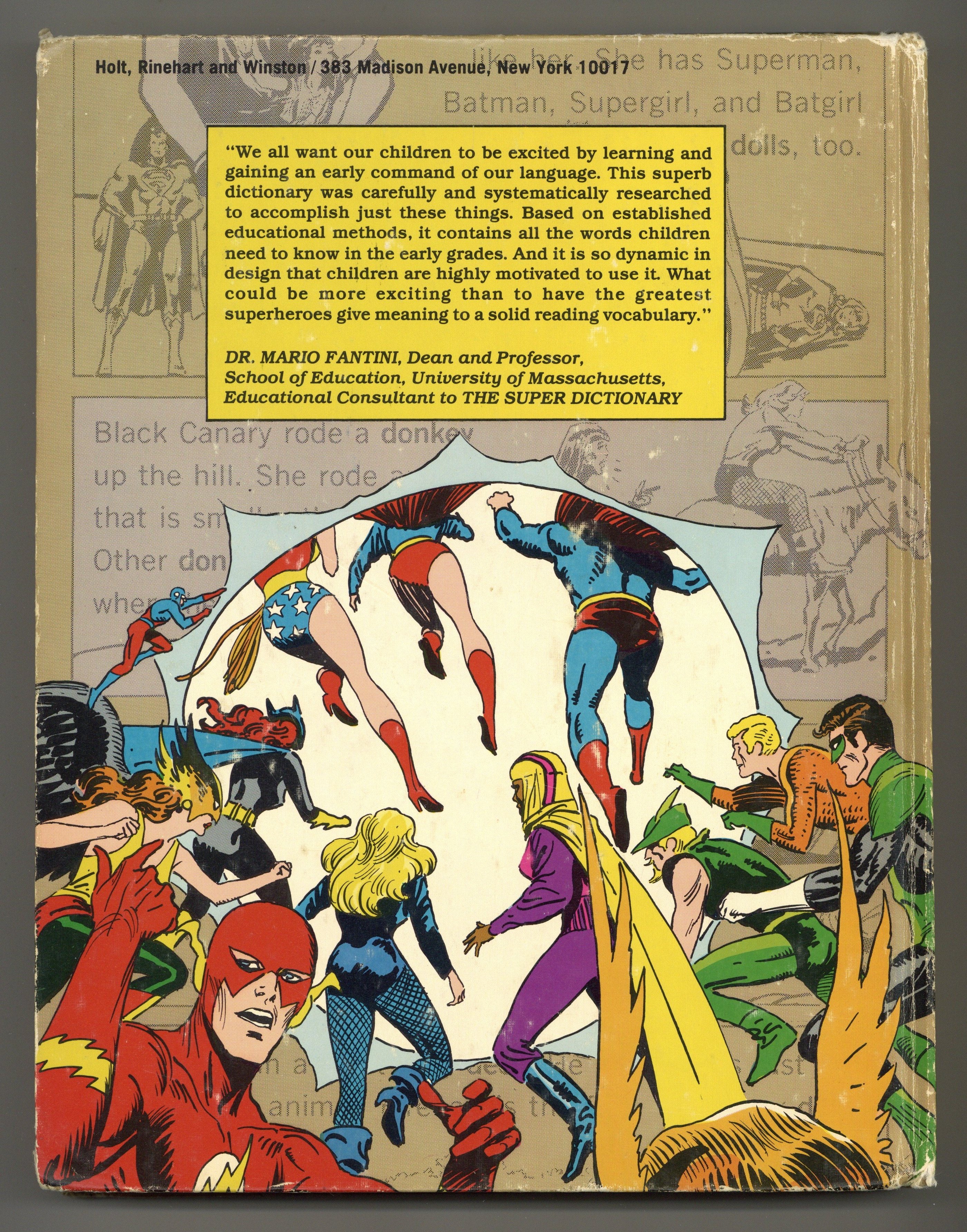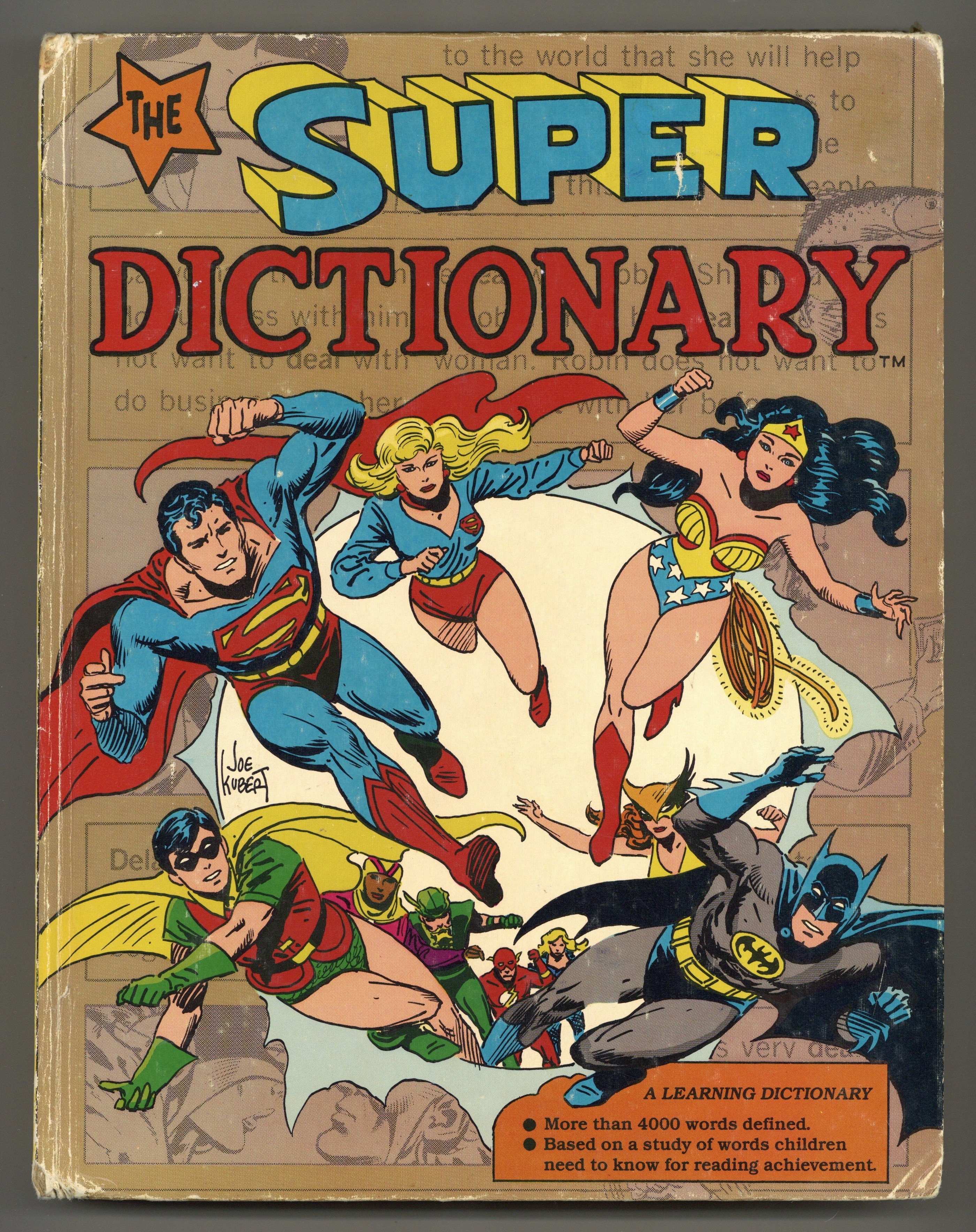 The Super Dictionary is a learning dictionary for young children. Published by Warner Educational Services in partnership with DC Comics. New front and back covers by Joe Kubert, plus, it appears, some spot illustrations. Most of the artwork is culled from previously-existing stories by Neal Adams, Gil Kane, and many others.
