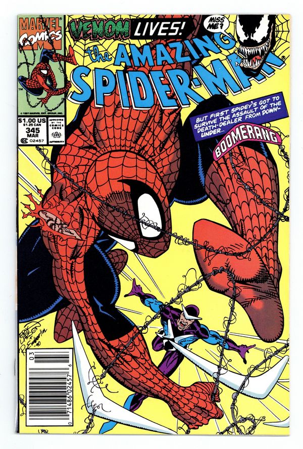 Starts May 18 Mark Jeweler Advertisement Insert Variant. Second appearance of.Cletus Kasady (Carnage) in "Gun From the Heart!" Script by David Michelinie, pencils by Mark Bagley, inks by Randy Emberlin. Spidey fights Boomerang; Venom cameo. Erik Larsen/Emberlin cover. The letters page has a statement of ownership--average print run 489,589; average paid circulation 334,893. Cover price $1.00.