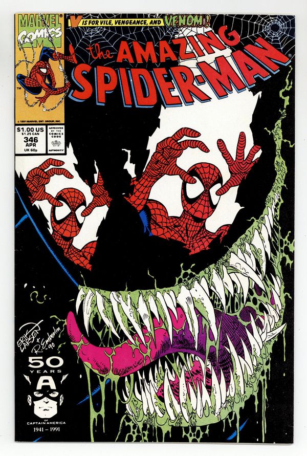 Starts Jan 19 Direct Edition. Cover pencils by Erik Larsen, inks by Randy Emberlin. "Elliptical Pursuit!", script by David Michelinie, pencils by Erik Larsen, inks by Randy Emberlin; Eddie Brock is back…for Peters head!; After escaping prison, Venom taunts Spider-Man into a final showdown; Peter Parkers known for his smarts--why then does he stumble straight into Venoms trap?; An all-out smack down slugfest ensues. 36 pgs., full color. Cover price $1.00.