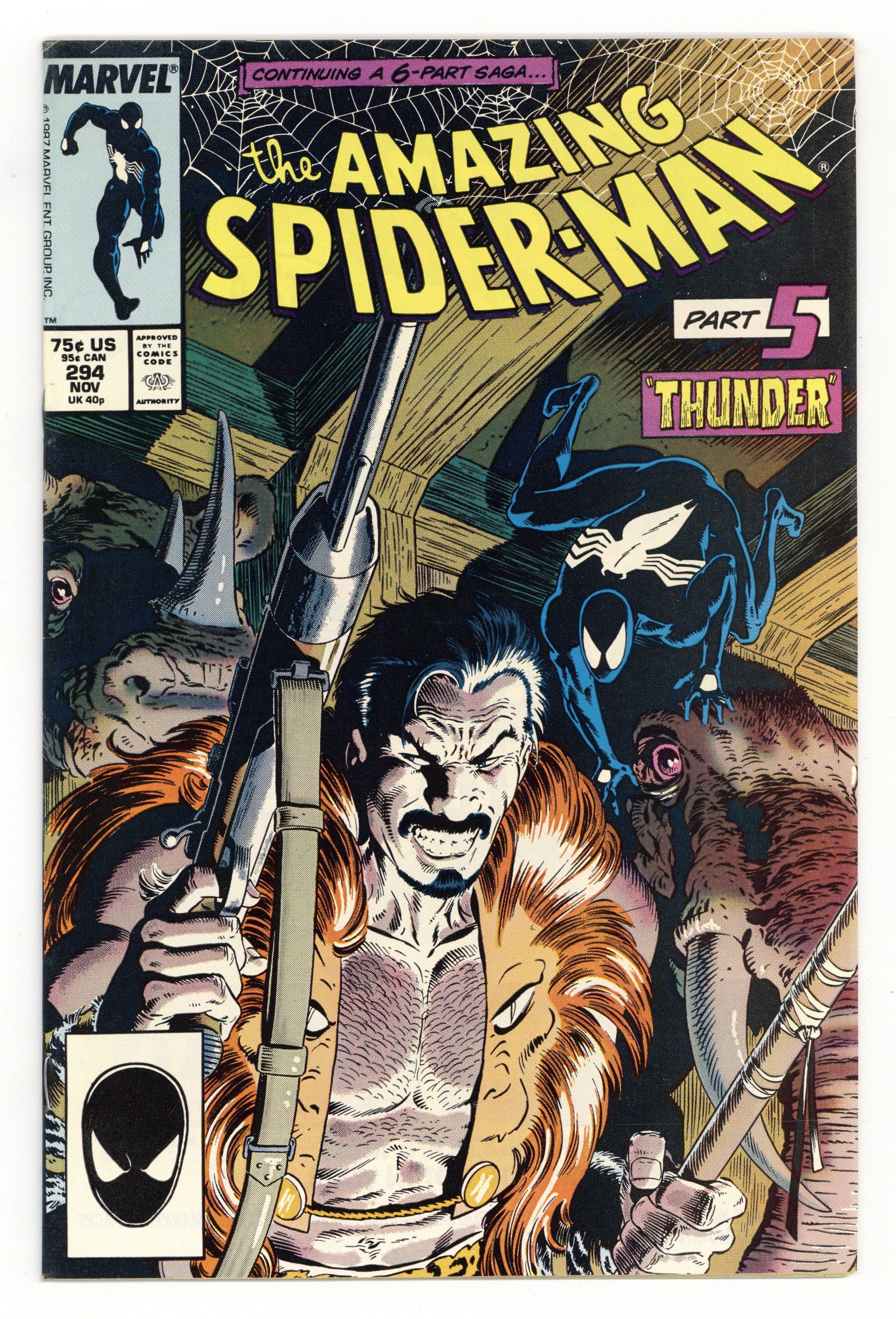 Starts Jan 19 Newsstand Edition. First appearance of Cletus Kasady aka Carnage in "Hearts and Powers." Script by David Michelinie. Pencils by Erik Larsen. Inks by Randy Emberlin. Cover by Erik Larsen and Randy Emberlin. In a warehouse on the waterfront, the Spectacular Spider-Man runs into a new costumed crusader...Cardiac! Is he a hero or villain or vigilante or all of the above? After a brief confrontation, the web-slinger isn't quite sure! But later on, at a chemical plant in the Bronx, Cardiac and the wall-crawler are forced to team up to tackle the rampaging Rhino! So, Spidey will consider Cardiac a friend...for now! Meanwhile, in Ryker's Island, Eddie Brock gets to know his new cellmate: Cletus Kasady...the future Carnage! Cameo appearances by Justin Hammer and Mary Jane Watson. 36 pages. $1.00 cover price. Cover price $1.00.