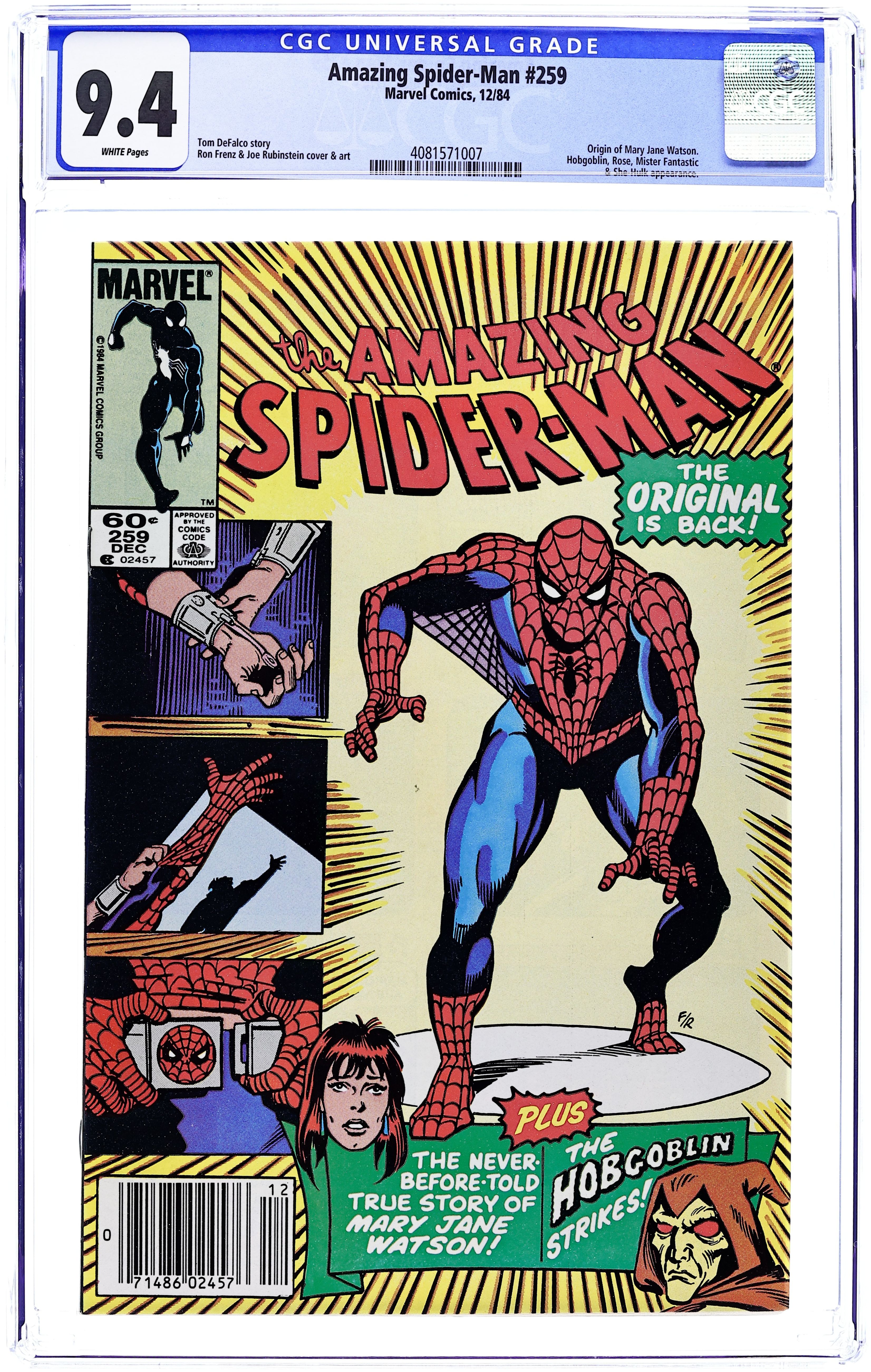 Ends Jan 13 7:08 PM CST Bid History 15 bids Current Bid $460 Your Secret Max Bid If you'd like to bid, please log in or register. Cover art by Steve Ditko. Third appearance of the Sandman in The End of Spider-Man!, script by Stan Lee, art by Steve Ditko; With the entire city thinking he is a coward, Spider-Man runs from Sandman; Peter's life is in shambles, and he contemplates giving up being Spider-Man to concentrate on his personal life; Cameos by the Avengers, Daredevil, the Fantastic Four, the Green Goblin, Kraven the Hunter, Doctor Octopus, and the Vulture. First appearance of Ned Leeds (later Hobgoblin). Reprinted in Marvel Tales # 13 and 156. Letter to the editor from comics artist Frank Brunner. 36 pgs. $0.12. Cover price $0.12.