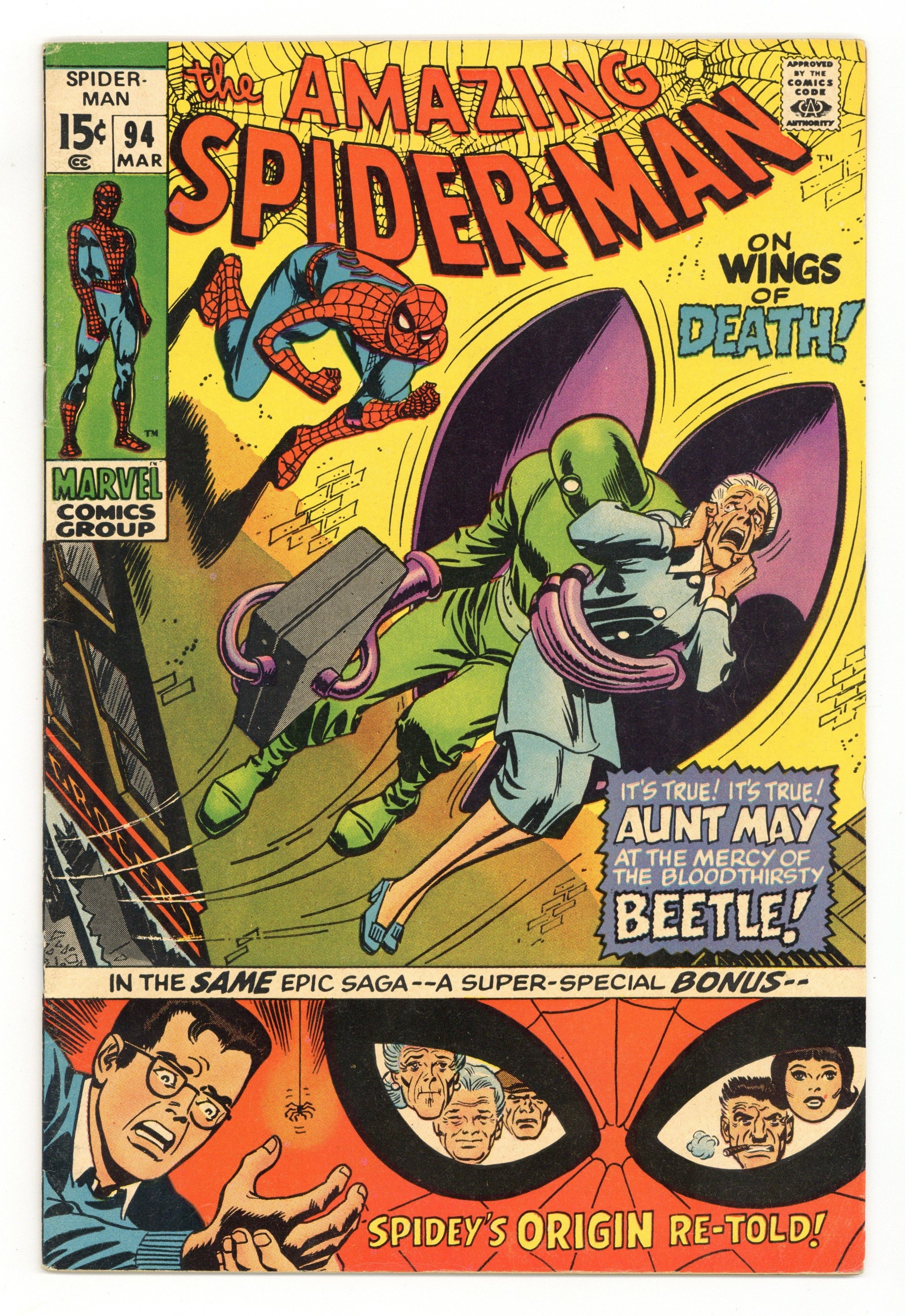 Ends Jan 13 7:10 PM CST Bid History 8 bids Current Bid $46 Your Secret Max Bid If you'd like to bid, please log in or register. Cover art by Steve Ditko. Second appearance of the Beetle in Where Flies the Beetle...!, script by Stan Lee, art by Steve Ditko; after getting out of jail, Abner Jenkins dons his Beetle guise and prepares for revenge on the Human Torch; drama between Johnny Storm and Doris Evans and Peter Parker and Betty Brant; Human Torch teams with Spidey against Beetle. Reprinted in Marvel Tales # 16 and 159. Spider-Man pin-up by Ditko. 36 pgs. $0.12. Cover price $0.12.