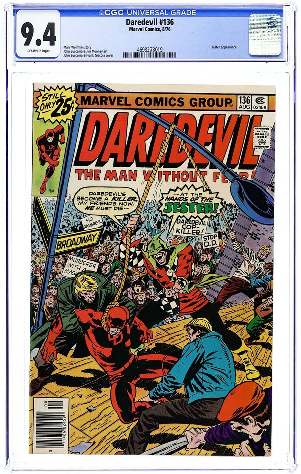 Starts Apr 27 Cover pencils by Gene Colan, inks by Frank Giacoia (photo Background). The Dismal Dregs of Defeat, script by Stan Lee, pencils by Gene Colan, inks by Vince Colletta; With the police thinking he is a murderer, Daredevil tries to avoid the law but is captured by the Jester and sent to jail. Letters to the editor from Tony Isabella, Peter Sanderson, and Ted White. 36 pgs. Cover price $0.12. Cover price $0.12.