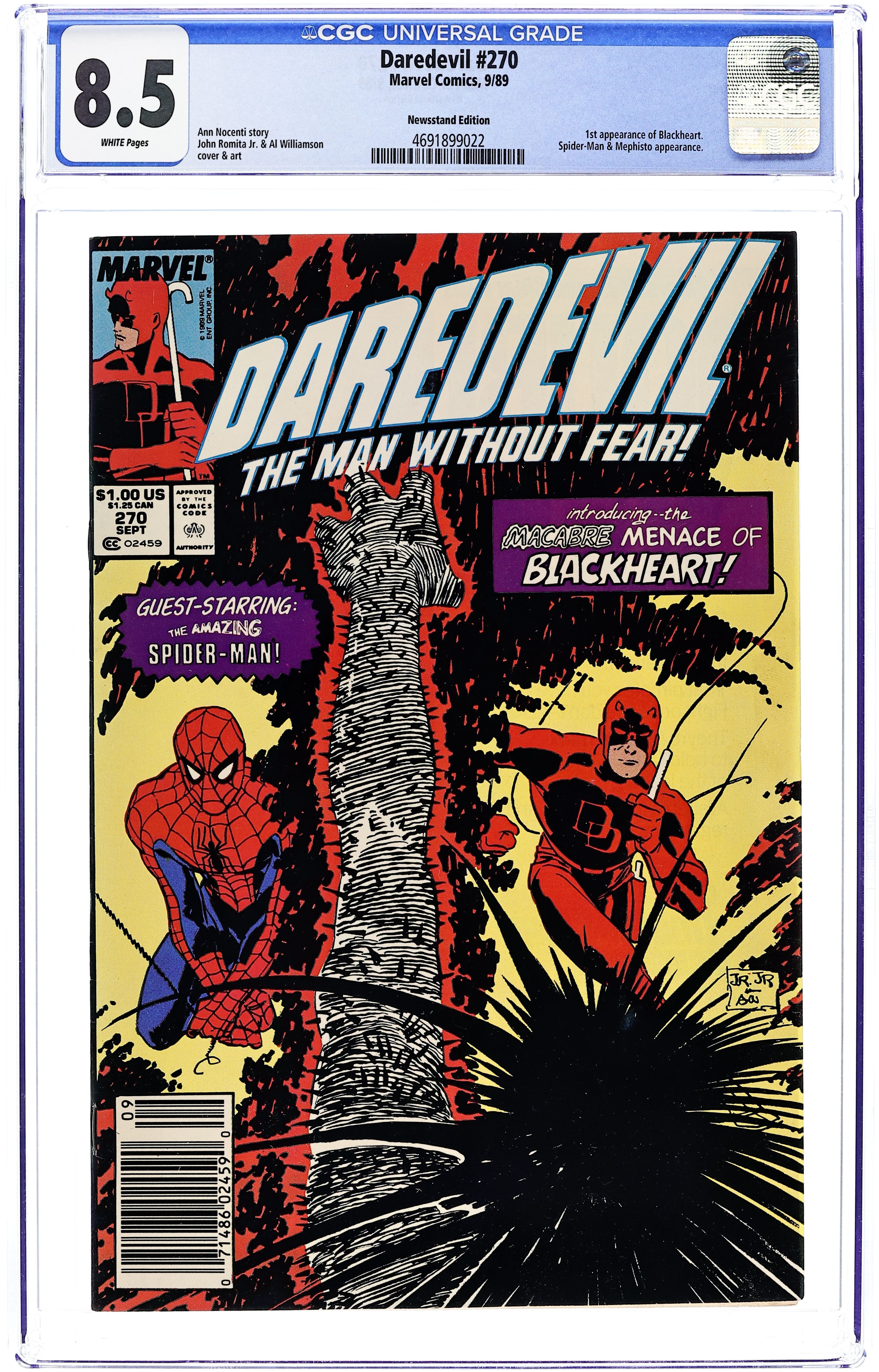 Starts May 4 Newsstand Edition. Cover pencils by John Romita, Jr., inks by Al Williamson. 1st appearance of Blackheart (the son of Mephisto) in Blackheart!, script by Ann Nocenti, pencils by John Romita, Jr., inks by Al Williamson; On a hill of humanity's evil, Blackheart is born and DD and Spider-Man have to fight like the devil to take him down; Mephisto appearance. First $1.00 cover price. 36 pgs. Cover price $1.00. Cover price $1.00.