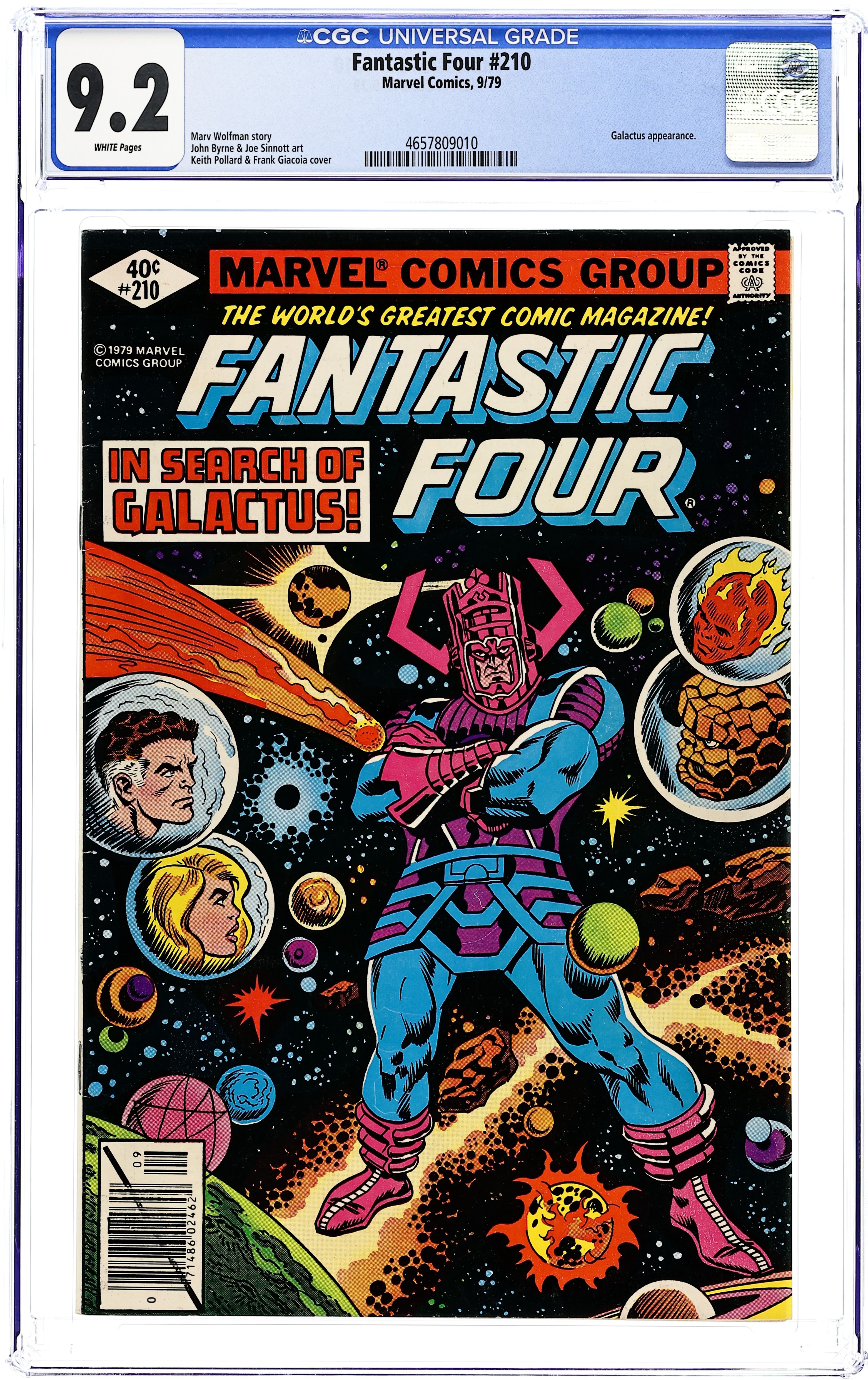 Starts Jan 19 Direct Edition. "In Search of Galactus" Written by Marv Wolfman. Pencils by John Byrne. Inks by Joe Sinnott. Cover by Keith Pollard and Frank Giacoia. The Fantastic Four locate Galactus' ship and confront the Devourer of Worlds inside! Galactus is open to the possibility of coming to Earth to battle the Sphinx, but the FF must do him a favor first...find his next herald! Note: The FF's preceding encounter with Galactus was in Fantastic Four 175. Cover price $0.40.