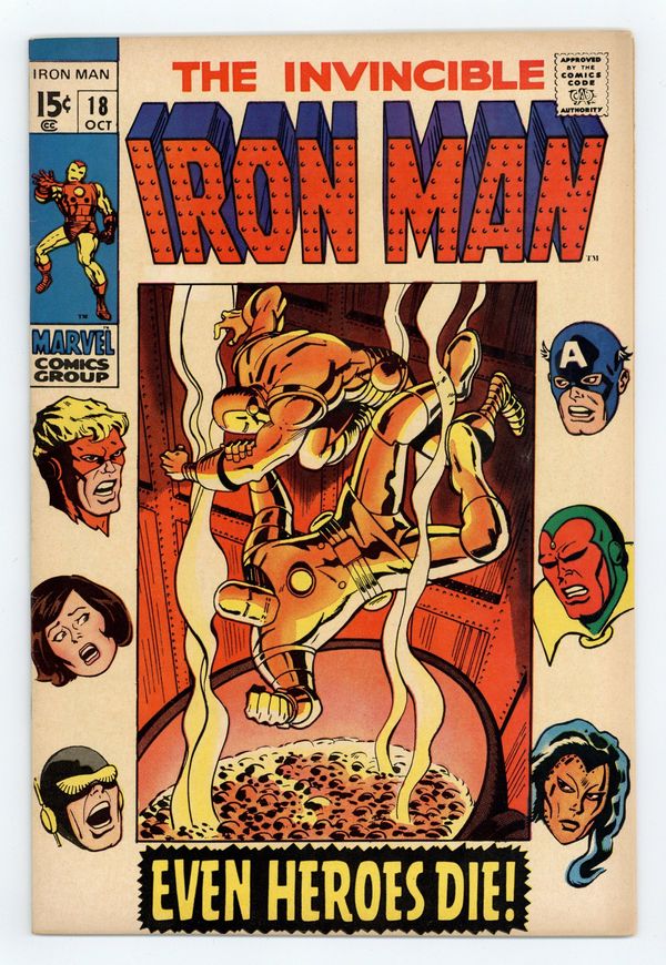 Starts May 25 Fate of Tony Stark: Part 2 of 4 - "Even Heroes Die!" Guest-starring the Avengers. Story by Archie Goodwin. Art by George Tuska and Johnny Craig. It's an action-packed issue as Midas sends Tony and Madame Masque to break into Stark Industries to capture...Tony Stark! However, Midas does not know that he already has the real Tony Stark, and it's the life model decoy that is actually running Stark Industries. What a twist! When the life model decoy dons Iron Man's armor, Tony only has one option...wear the old golden suit of armor. Will the Avengers arrive in time to save Tony? And is Madame Masque having second thoughts about working for Midas? The story of Iron Man's failing heart condition continues in Avengers 69. Cameo appearances by Captain America and Nick Fury. Avengers Lineup: Goliath, Vision, Wasp, and Yellowjacket. 32 pages Cover price $0.15.