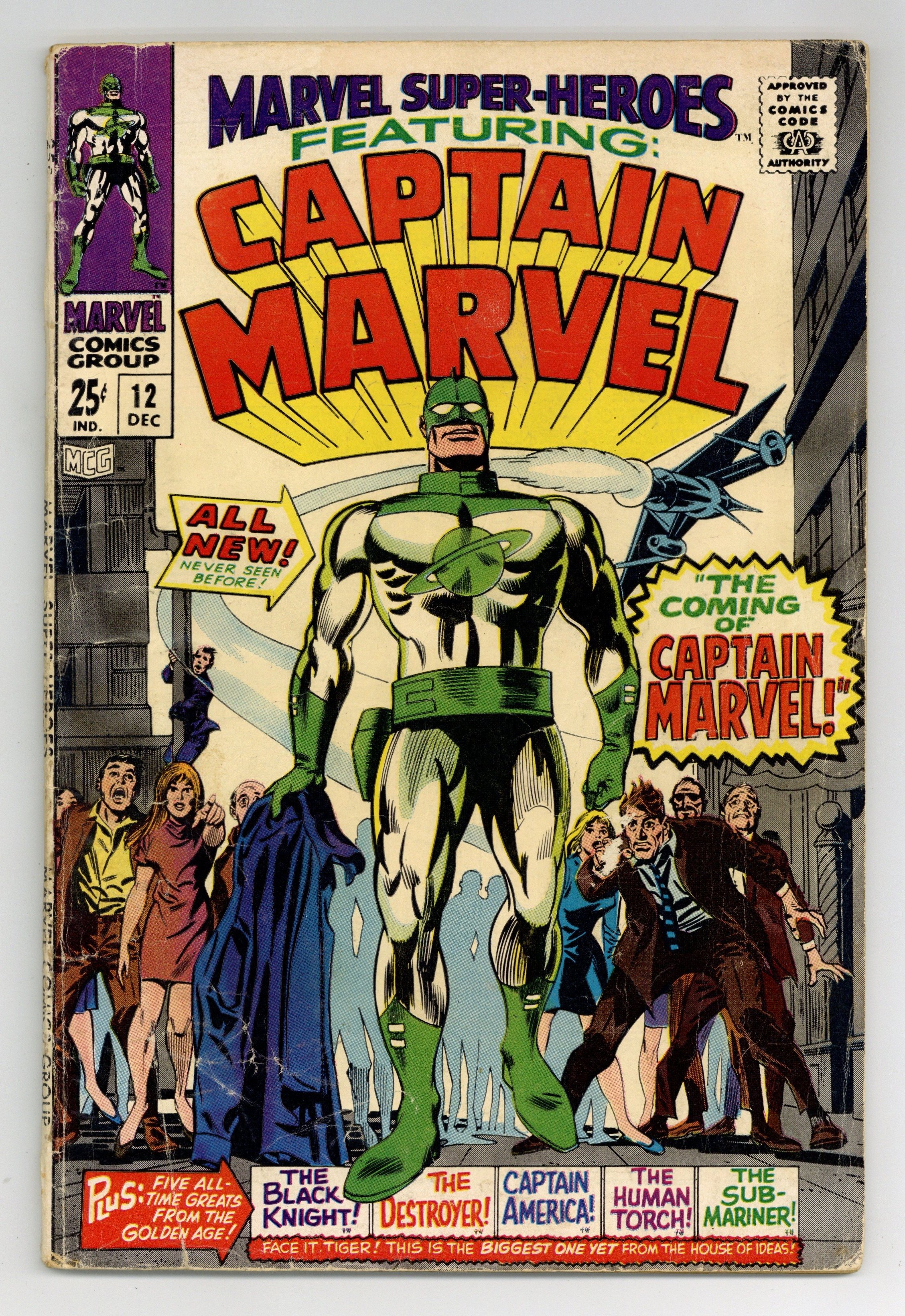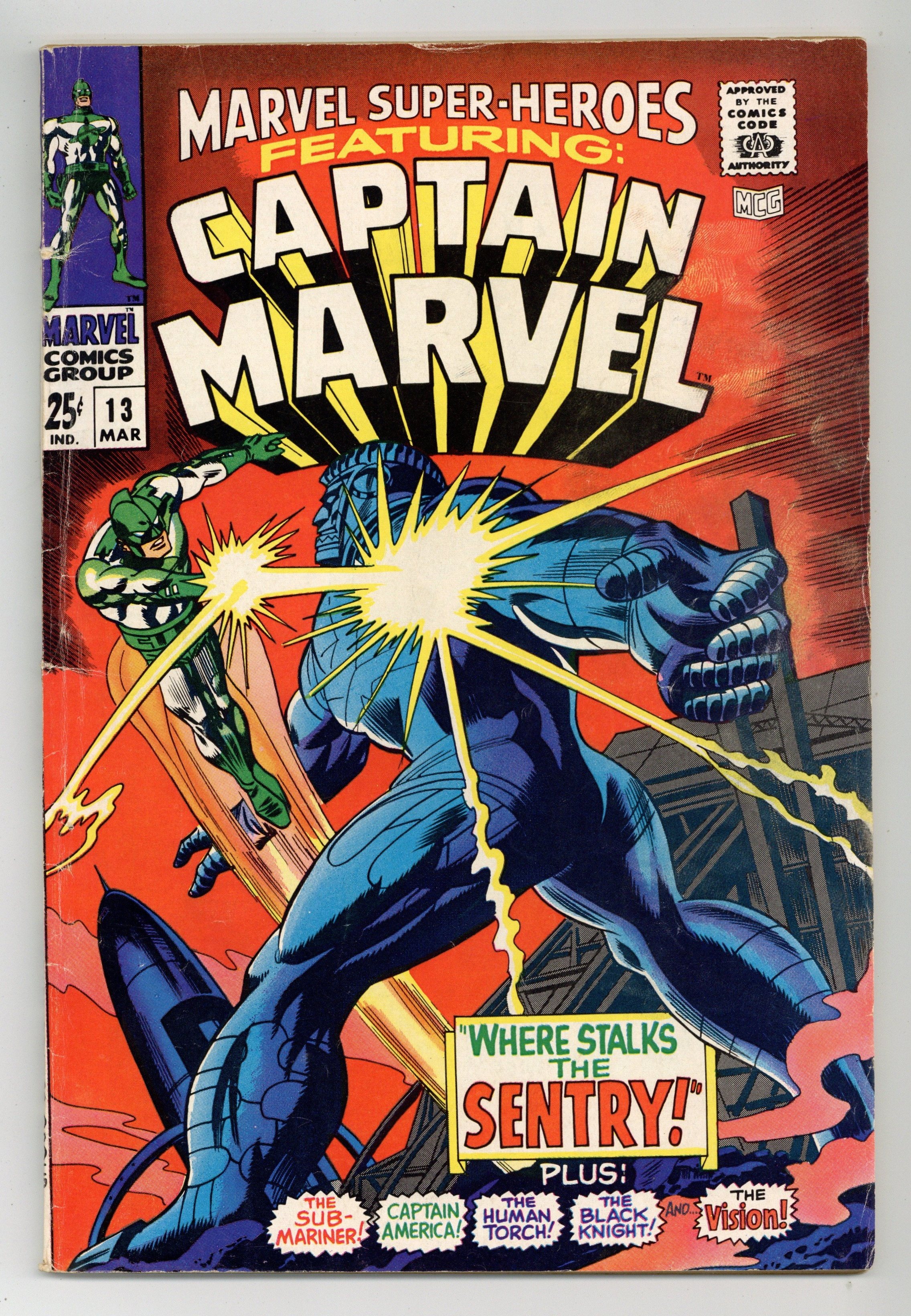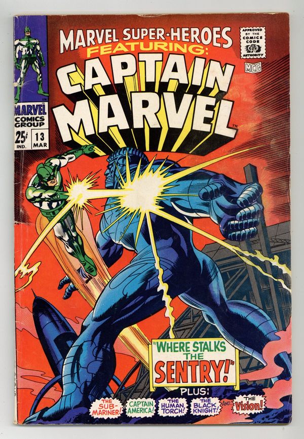 Starts Dec 8 Giant-size issue. Captain Marvel stars in "Where Stalks the Sentry!" Script by Roy Thomas, pencils by Gene Colan, inks by Paul Reinman. The story continues in Captain Marvel 1 (1968). The remainder of the issue consists of Golden Age reprints: the Black Knight by Joe Maneely (1955), the Human Torch by Dick Ayers ("Fugitive at Large!"; 1954); the Vision (1941); Captain America by John Romita Sr. ("Top Secret!"; 1953); and the Sub-Mariner by Bill Everett ("Invasion!"; 1955). Letter to the editor from comic artist Dave Cockrum. Colan cover pencils. 1st Carol Danvers (pre Ms. Marvel). Cover price $0.25.