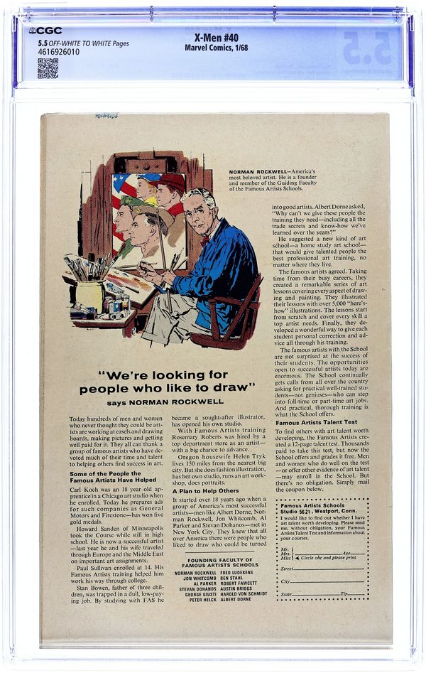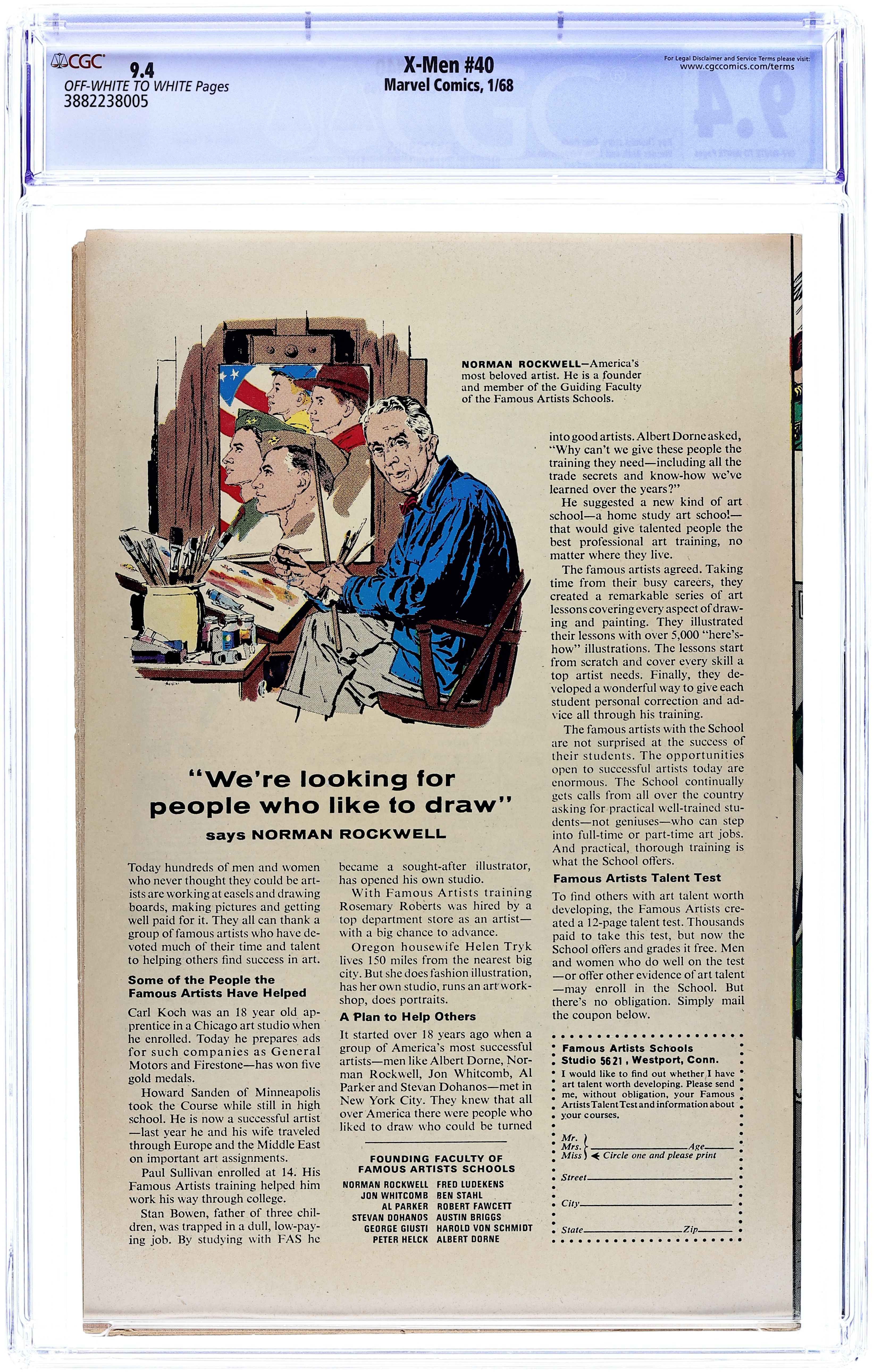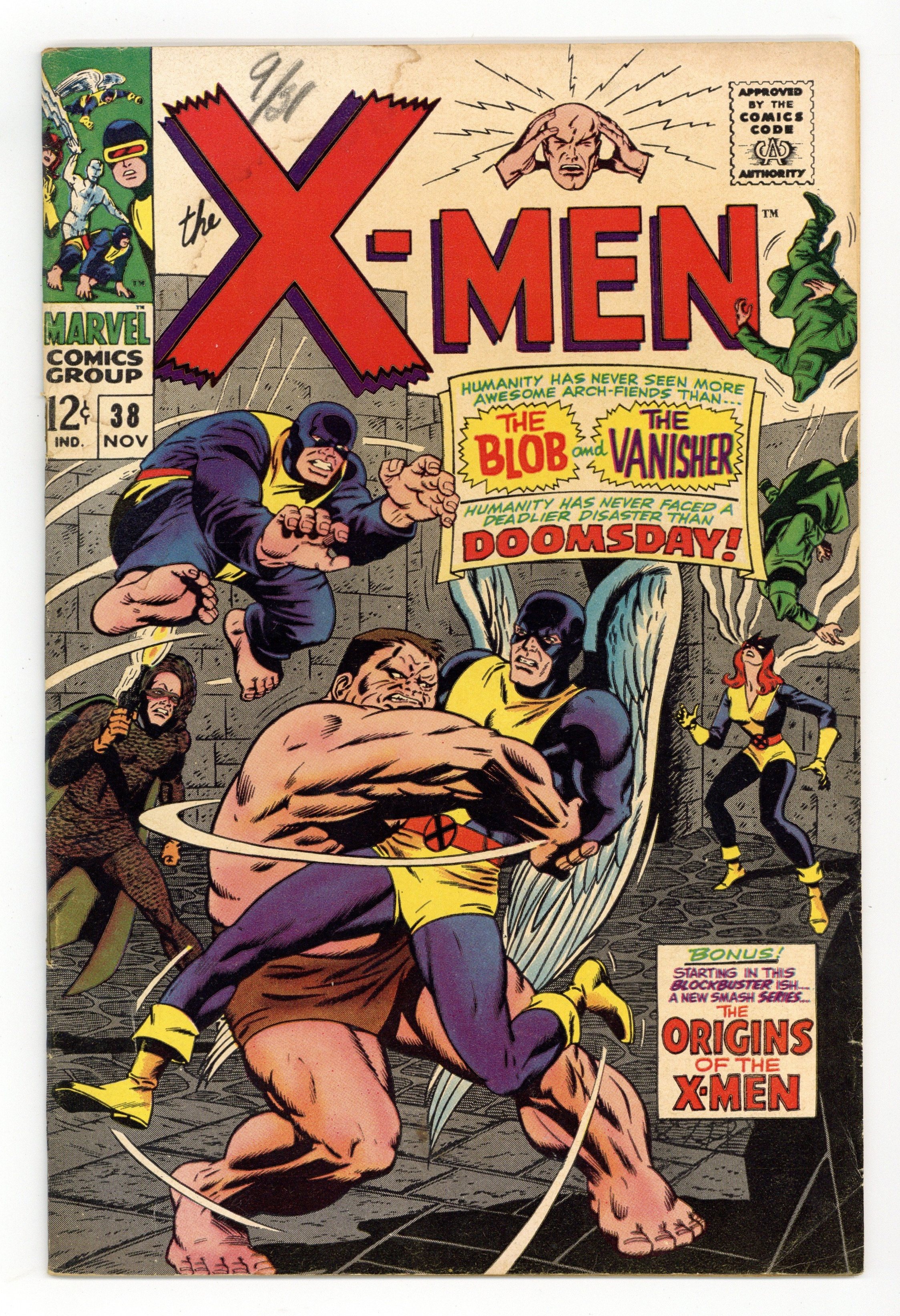 Starts Jan 3 Cover pencils by Jack Kirby, inks by Chic Stone. The Return of the Blob, script by Stan Lee, pencils by Jack Kirby, inks by Chic Stone; The X-Men graduate from Xavier's school and the Professor tells them that he is taking a leave of absence; He puts Cyclops in charge while he is away and shows him his new mutant detecting machine, Cerebro; Magneto tracks down the Blob and invites him to join the Brotherhood; During a scuffle, Xavier's mental blocks dissolve and Blob remembers the secret of the X-Men; As this happens, the Blob's name lights up on Cerebro and Scott calls the X-Men away from a day of relaxation and back to battle with the evil mutants; During the battle with the Brotherhood, Magneto shoots missiles at the X-Men, even though the Blob is in the line of fire, and the hefty mutant, feeling betrayed, decides to return to carnival life. 1st appearance of Cerebro. 36 pgs. $0.12. Cover price $0.12.