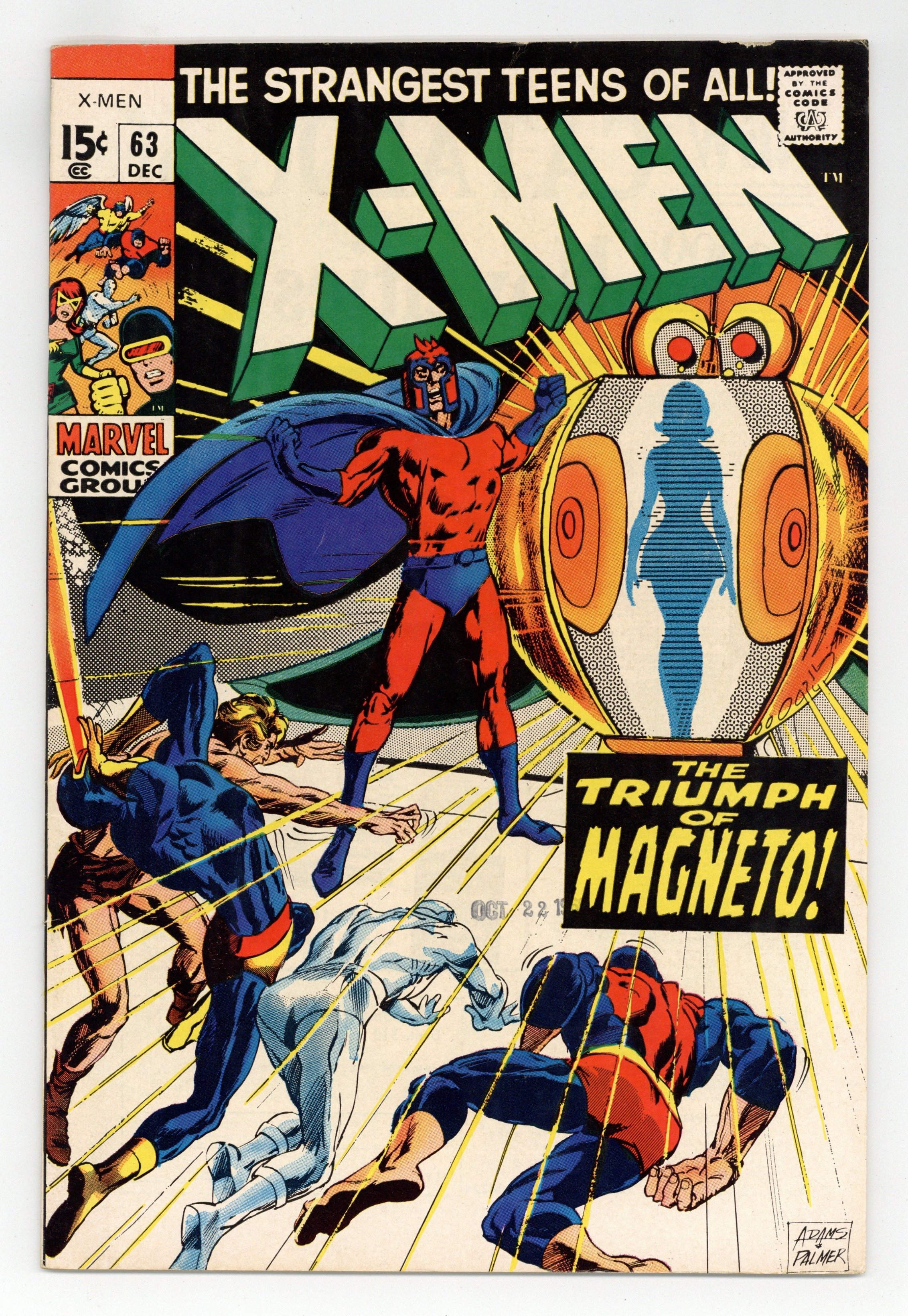 Starts Apr 4 First appearance of Lorna Dane (Polaris). Cover art by Jim Steranko. Who Dares Defy the Demi-Men?, script by Arnold Drake, pencils by Don Heck and Werner Roth, inks by John Tartaglione; Angel warns Jean about Cerebro beeping loudly, and she tells the other X-Men; a group commanded by Mesmero uses a machine (along with his powers) to turn latent mutants into full-fledged mutants in order to form his army; 1st appearance of Mesmero. A Beast Is Born--The Origins of the Uncanny X-Men, script by Arnold Drake, art by Werner Roth; how Beast got his powers. Letter to the editor from comic writer Tony Isabella. 36 pgs. $0.12. Cover price $0.12.