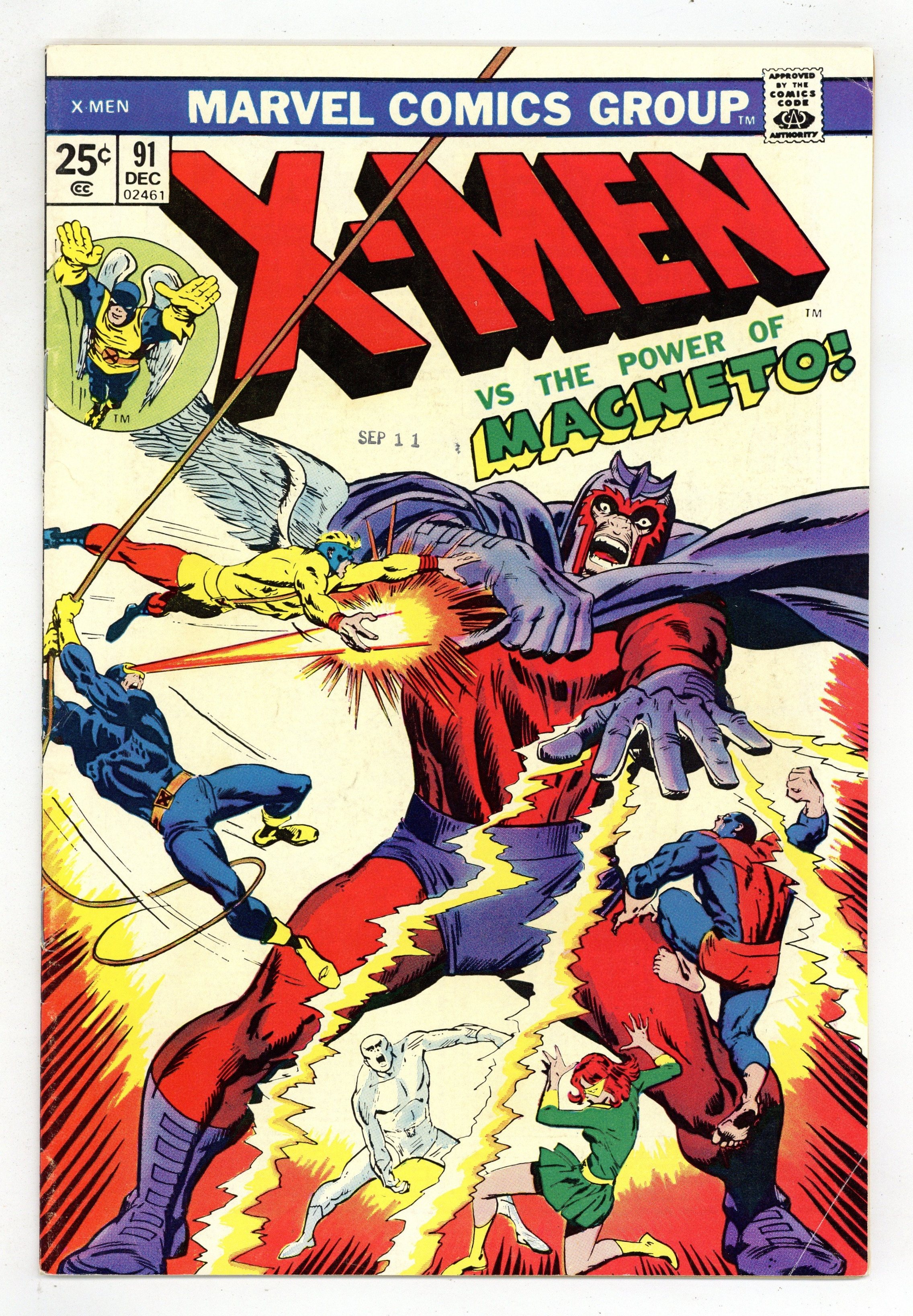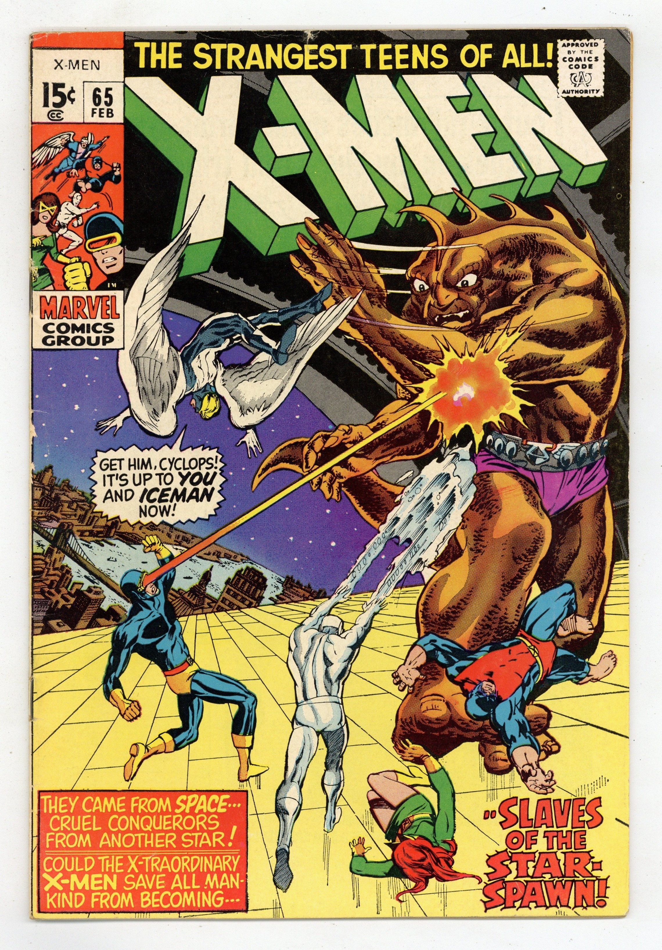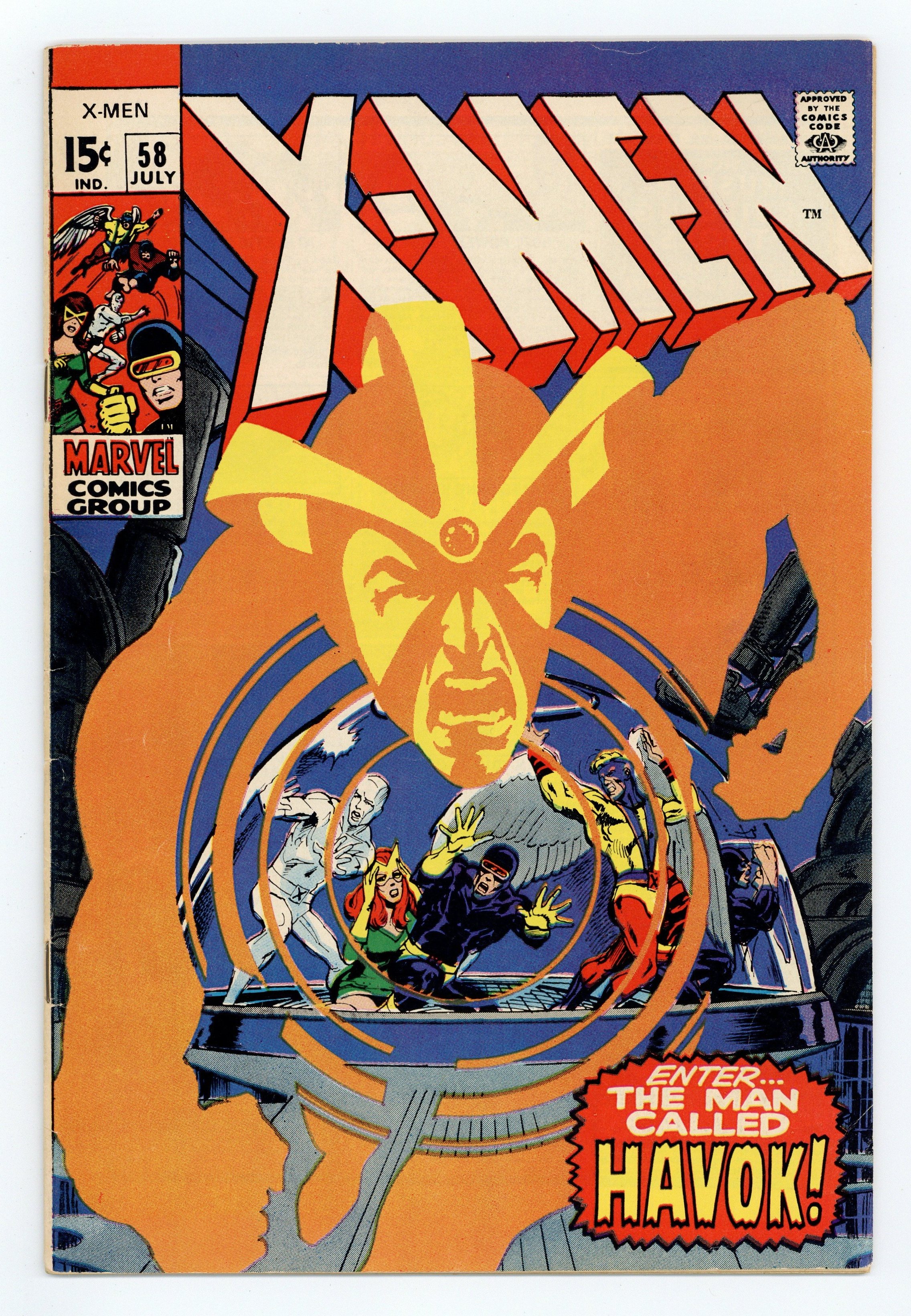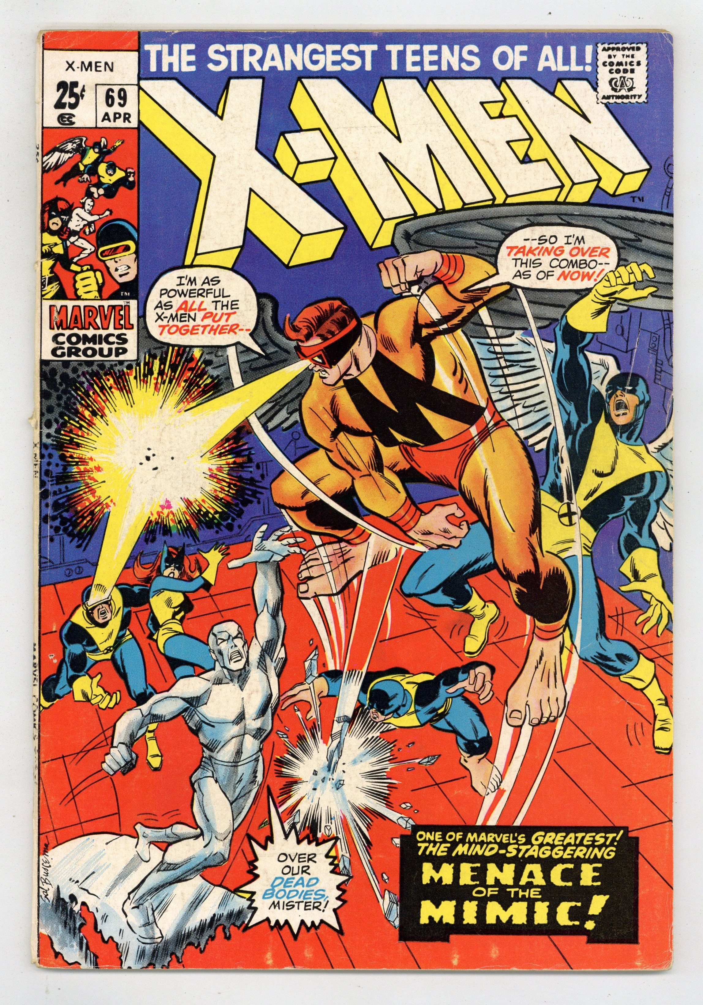 Starts Apr 4 First appearances of Alex Summers (later Havok) and the Living Pharaoh. Cover pencils by Barry Windsor-Smith [as Barry Smith] and John Romita (on Living Pharaoh figure), inks by Vince Colletta. Wanted: Dead Or Alive--Cyclops!, script by Arnold Drake, pencils by Don Heck and Werner Roth, inks by Vince Colletta; the X-Men battle Ahmet "The Living Pharaoh" Abdol, who has captured Cyclops' younger brother, Alex; two cops try to arrest Cyclops for the murder of Abdol. The Million Dollar Angel--The Origins of the Uncanny X-Men, script by Arnold Drake, pencils by Werner Roth, inks by Vince Colletta; Angel's origin. A letter from comics professional Bob Wiacek. This issue contains a statement of ownership--average print run 415,200; average paid circulation 273,360. 36 pgs. $0.12. Cover price $0.12.