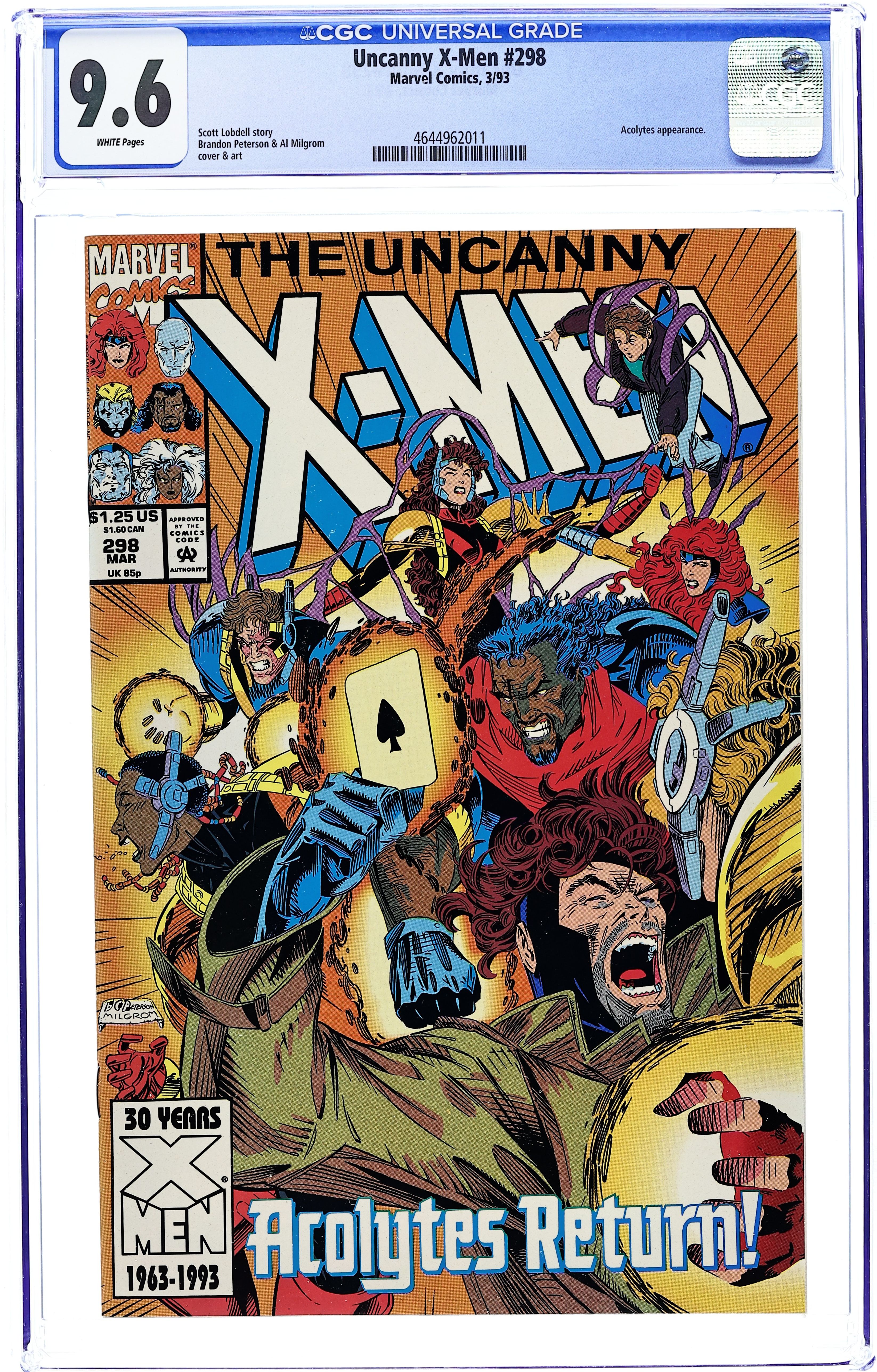 Starts Mar 9 Direct Edition. "...For the Children!" Story by Scott Lobdell. Art by Brandon Peterson and Al Milgrom. A school bus full of innocent kids is attacked and the only ones that can save them are the Uncanny X-Men. But first they'll have to deal with the startling return of the Acolytes! 36 pgs. Cover price $1.25.