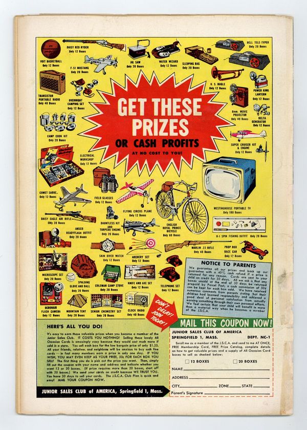 Starts Apr 20 Cover pencils by Curt Swan, inks by Stan Kaye. "The Land of A Million Supermen," script by Jerry Coleman, pencils by Wayne Boring, inks by Stan Kaye; When Clark Kent is accidentally stranded in the nation of Borgonia, he discovers that everyone there, including himself, must wear a Superman costume on pain of death... which is a giant trap the dictator of Borgonia has set for the real Superman. "The Jungle Eskimo" starring Congo Bill, art by Howard Sherman. So, You Want to Be an Engineer text story. "The Forbidden Robots," script by Otto Binder, art by Jim Mooney; Tommy and Brent stop the transport of smuggled forbidden robots. 36 Pages, Full Color. $.10 Cover price $0.10.