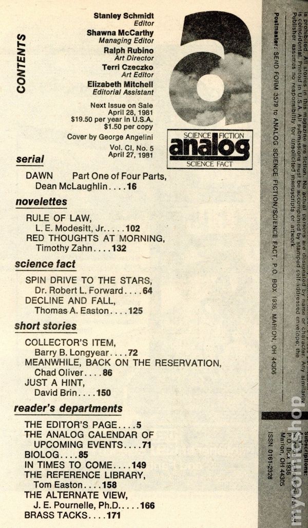 April 1981. Cover by George Angelini. Stories: "Dawn"(Part 1) by Dean McLaughlin, "Rule of Law" by L. E. Modesitt, Jr., "Red Thoughts at Morning" by Timothy Zahn, "Collector's Item" by Barry B. Longyear, "Meanwhile, Back on the Reservation" by Chad Oliver, and "Just a Hint" by David Brin. Science Fact article: "Spin Drive to the Stars" by Dr. Robert L. Forward, and "Decline and Fall" by Thomas A. Easton. Softcover, 5.25-in. x 7.5-in.; 178 newsprint pages, B&W. Cover price $1.50.