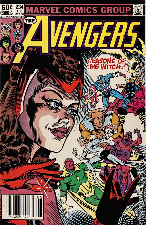 Newsstand Edition. "The Witch's Tale!" Script by Roger Stern. Art by Al Milgrom (breakdowns) and Joe Sinnott (finishes). Cover by Al Milgrom and Joe Sinnott. The battle against Annihilus has ended in victory, but the Avengers have suffered casualties, most notably the Vision. The Scarlet Witch and her teammates return to Avengers Mansion and place the Vision in the medical lab for recovery. While the other avengers go about their daily lives, Captain Marvel asks Wanda about her childhood and early days as an avenger. The Scarlet Witch takes a walk down memory lane, but with a new twist involving the Master of Magnetism. Plot continues in Doctor Strange (2nd series) 60. Retelling of the origins of Quicksilver and the Scarlet Witch. Cameo appearances by Doctor Strange and Hawkeye. Flashback cameos by Agatha Harkness, Bova, Crystal, Django Maximoff, Doctor Doom, Immortus, Magda, Magneto, Quicksilver, the Toad, the High Evolutionary, and the original X-Men. (Note: Wanda learned that Magneto is her father in the fourth issue of the Vision and the Scarlet Witch (1982) Limited Series.) 36 pgs. Cover price $0.60.