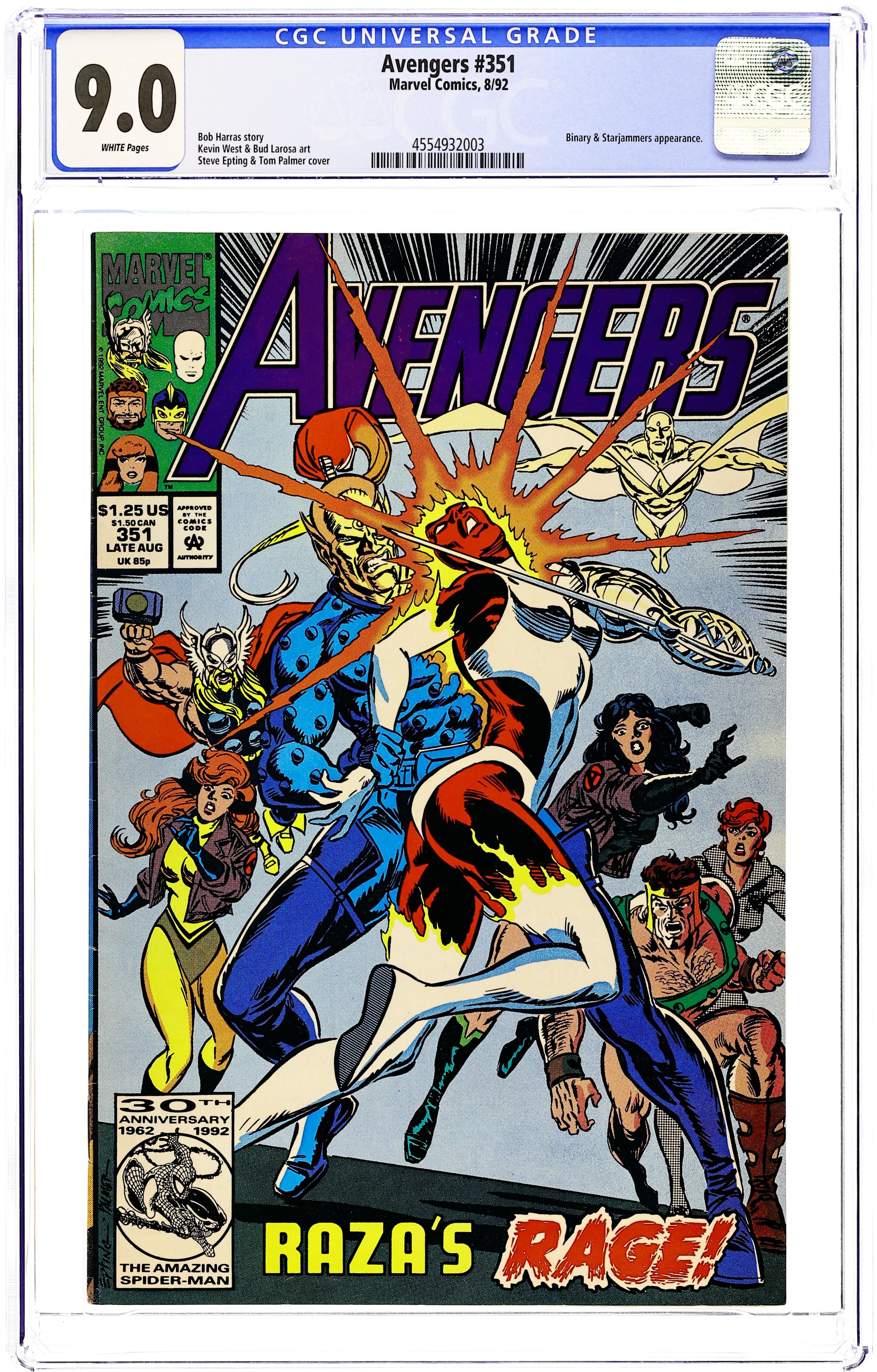 "Retribution!" Script by Bob Harras. Pencils by Kevin West. Inks by Bud LaRosa. Cover by Steve Epting and Tom Palmer. In shocking fashion last issue, Raza stabbed the Black Knight during their duel in the hangar bay! And upon discovering their fallen teammate, Earth's Mightiest Heroes lash out at the Starjammers! Hercules and Thor drive Raza and Ch'od out of the mansion and temporarily defuse the situation! But the Avengers still want vengeance! So, the Black Widow sends the Vision, Prince of Power, thunder god, Sersi, and Binary to chase the renegade Starjammers, while Crystal oversees Dane's emergency medical treatment! When the Avengers catch up to the runaway space pirates, the battle is short and sweet! How will Raza slime his way out of this mess? And back at the mansion, another treacherous starjammer makes her move to finish the job on the wounded knight! With "friends" like the Starjammers, the Avengers don't need any enemies! Cameo appearances by Cyclops, Professor Xavier, Lockjaw, Luna, and Quicksilver. 36 pages Cover price $1.25.