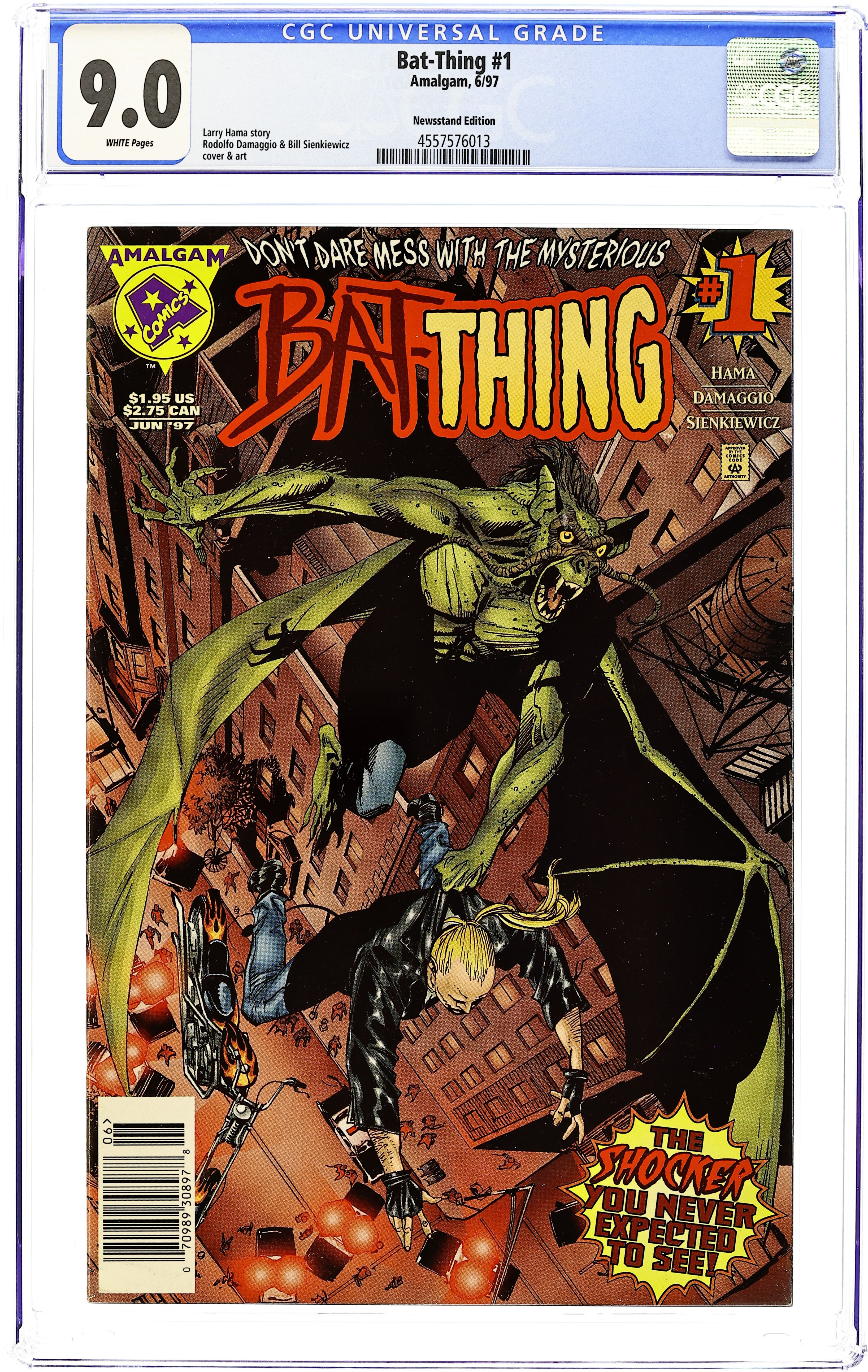 Newsstand Edition. "Someone to Watch Over Me!" Story by Larry Hama. Art by Rodolfo Damaggio and Bill Sienkiewicz. In order to save two universes, the young hero known as Access was forced to use the power of Amalgam (see Marvel versus DC (1996) #3). In this issue, The macabre Man-Thing and the tragic Man-Bat are merged to create the Bat-Thing. This cursed creature is forced to stalk the night, seeking out evil wherever it may dwell. Cover price $1.95.