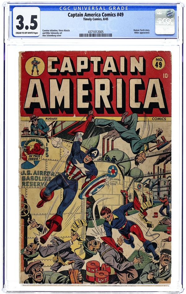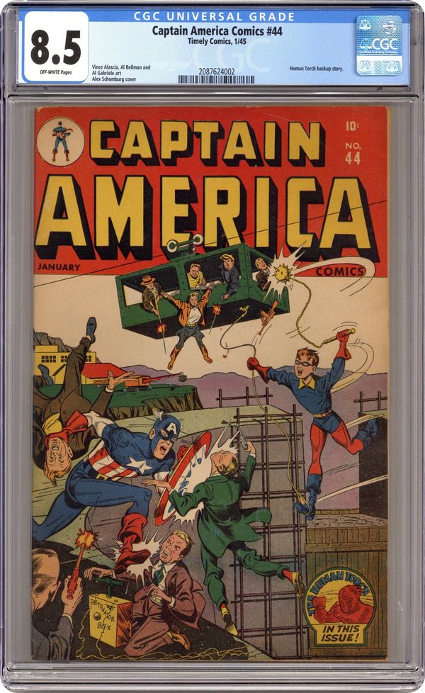 Captain America stars in "The Prophet of Hate!" (art by Vince Alascia), "The Graveyard of Ships," and "Midnight Means Murder." The Human Torch stars in "The Bandit Murder Gang!" 52 pgs. Cover price $0.10.