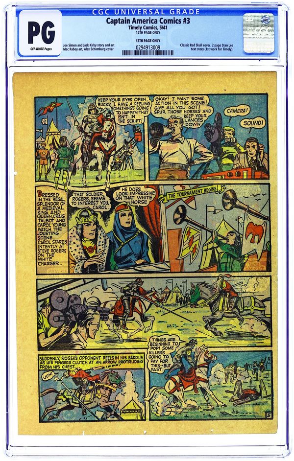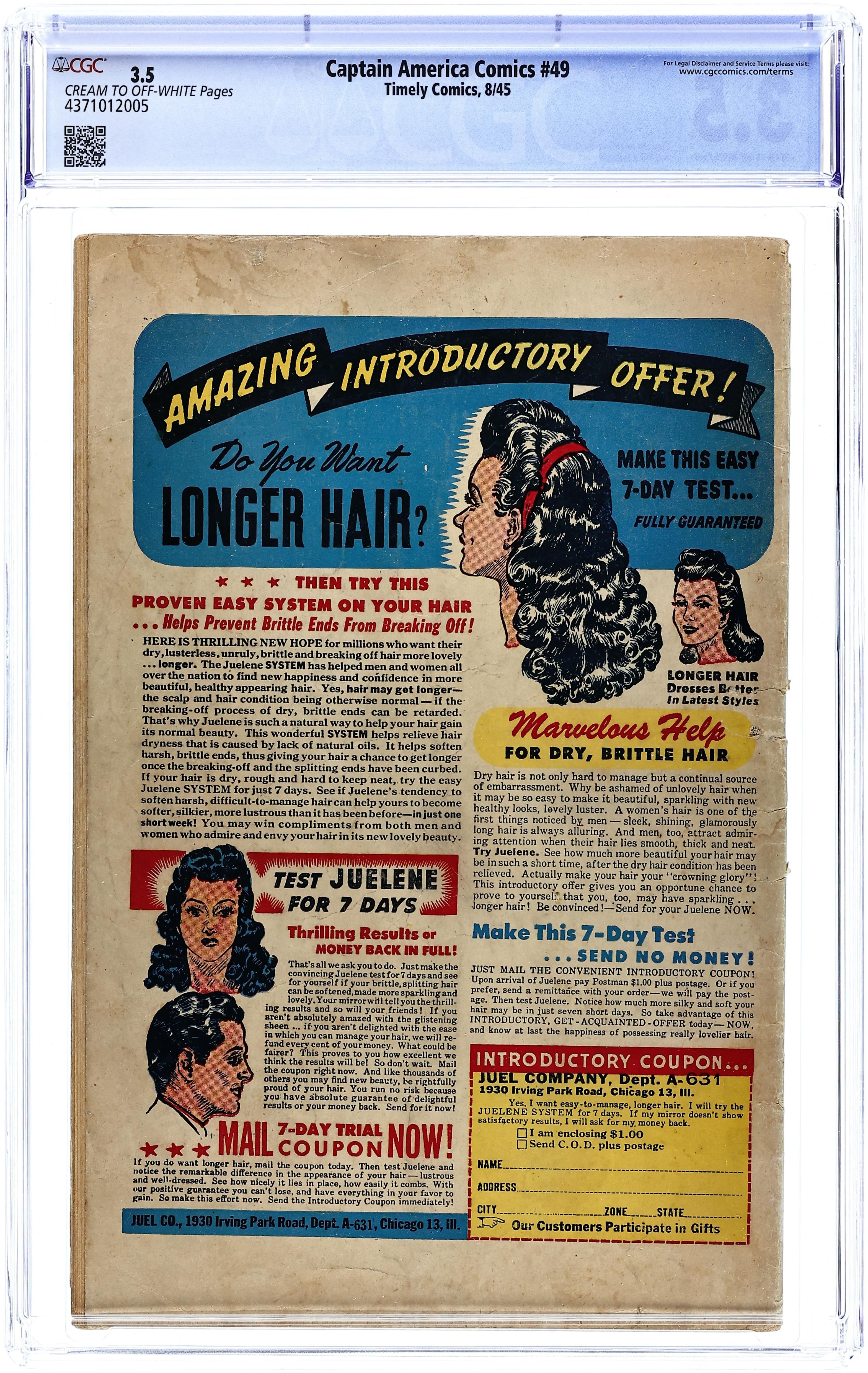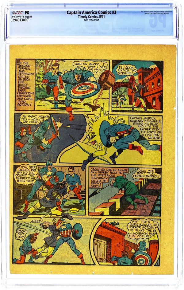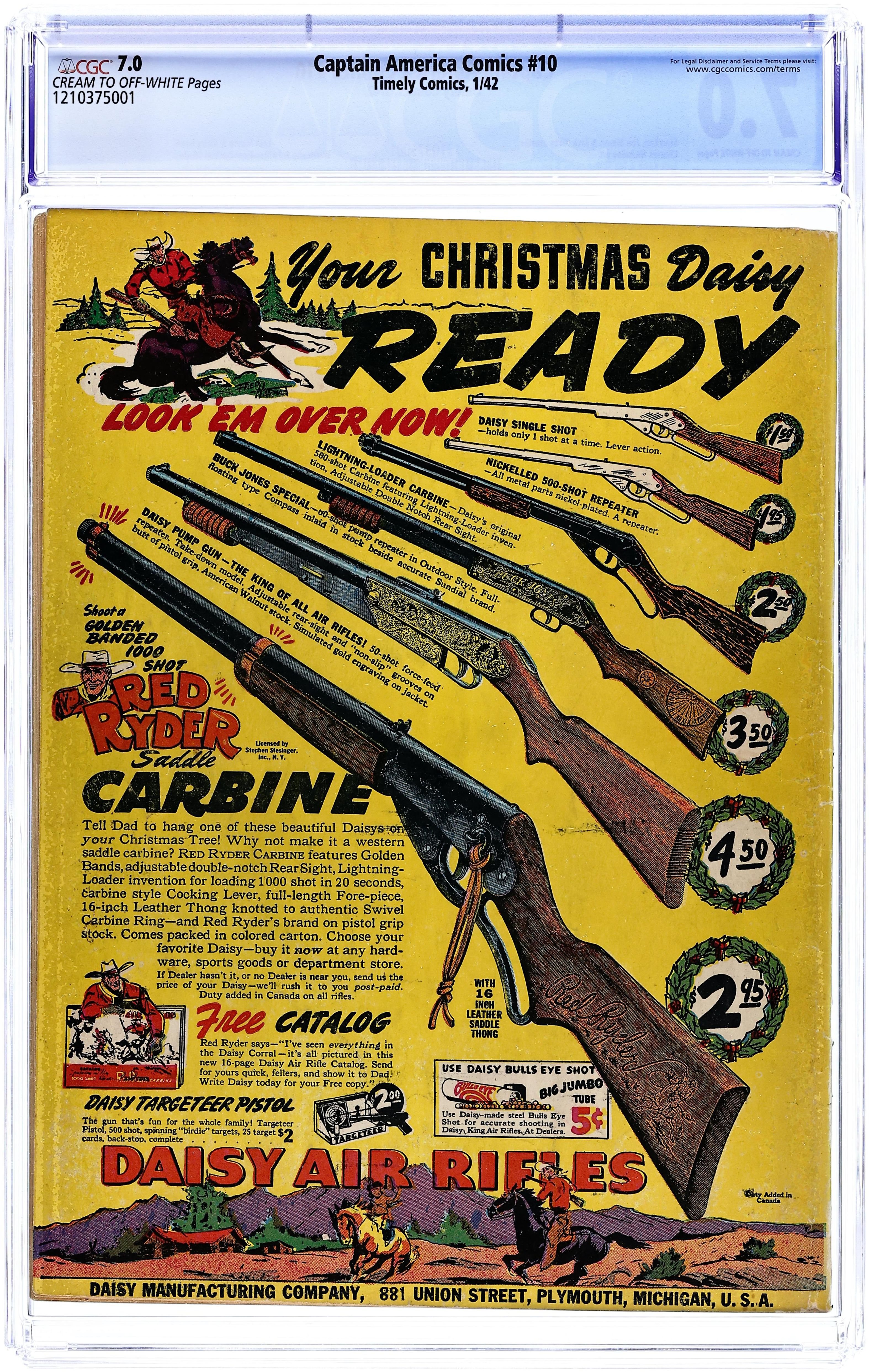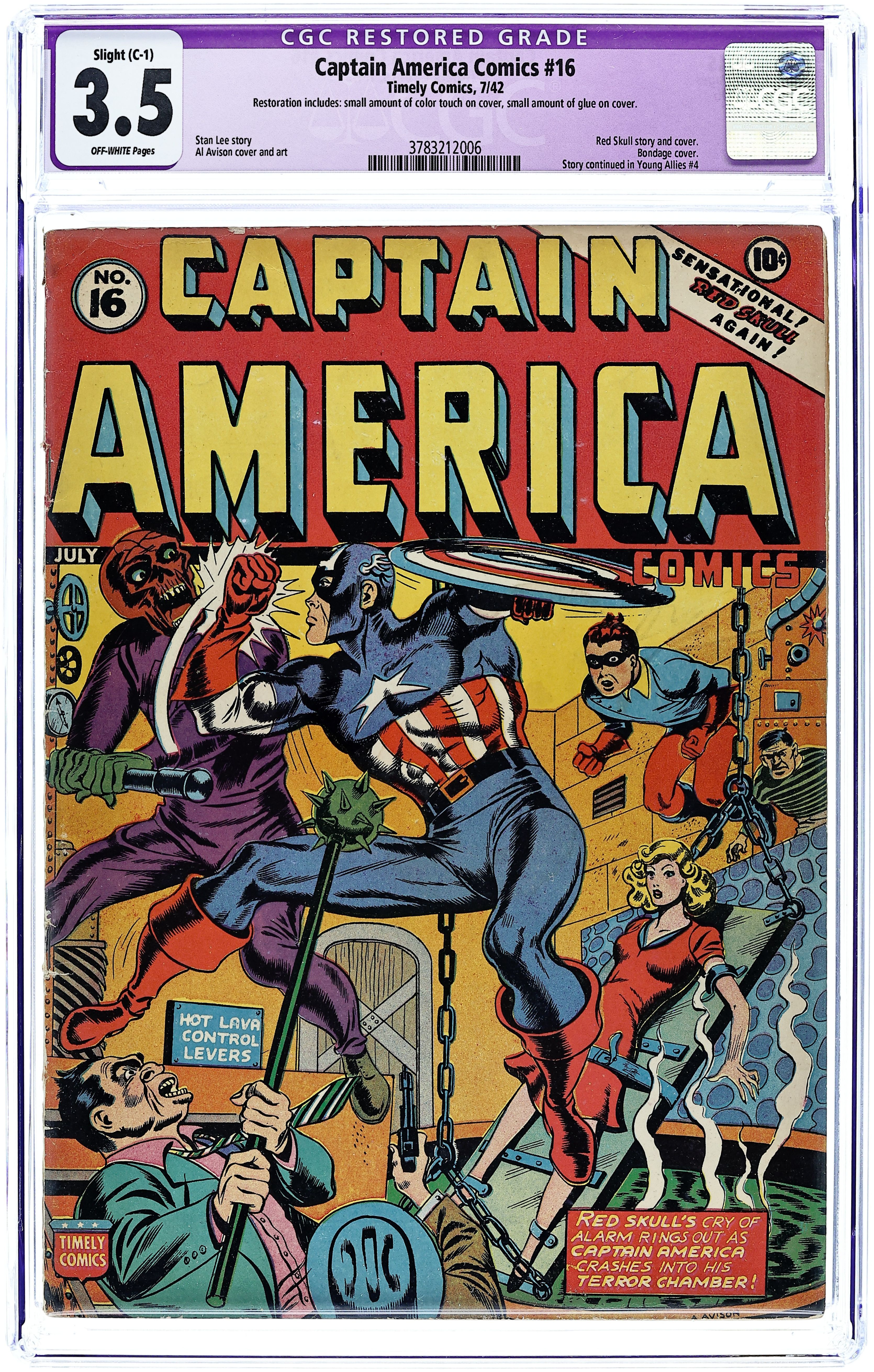 Cover art by Alex Schomburg. "The Return of the Red Skull," script and pencils by Joe Simon and Jack Kirby, inks by Simon, Kirby, Al Avison, and Al Gabriele; The Red Skull returns from the dead to wreak horrible vengeance on unsuspecting victims, including a phony Cap and Bucky, the brainchildren of a group of thugs. Sentinels of Liberty ad. "The Hunchback of Hollywood and the Movie Murder," script by Simon and Kirby, pencils by Kirby, inks by Bernie Klein and George Roussos; Death and terror lurk behind the scenes of a Hollywood movie set as Cap and Bucky hunt a hunchback madman, whose bloody hand seeks to stop the grinding cameras from filming the truth for a liberty loving public."Captain America Foils the Traitor's Revenge" text story by Stan Lee, art by Kirby. "The Queer Case of the Murdering Butterfly and the Ancient Mummies," script by Simon and Kirby, pencils by Kirby, inks by Reed Crandall; Laughing at law and order, the Butterfly loots a museum of its priceless treasures until Captain America and Bucky steps in to clip his wings. Human Torch ad. Untitled Tuk the Cave-boy story, script by Simon and Kirby, art by Mac Raboy; Tuk and Tanir help Princess Eve regain her rightful throne in Atlantis. Untitled Hurricane story, script by Simon and Kirby; The use of "infernal death boxes" in causing subway wrecks draws the attention of Hurricane. 68 pgs., full color. Cover price $0.10. Cover price $0.10.