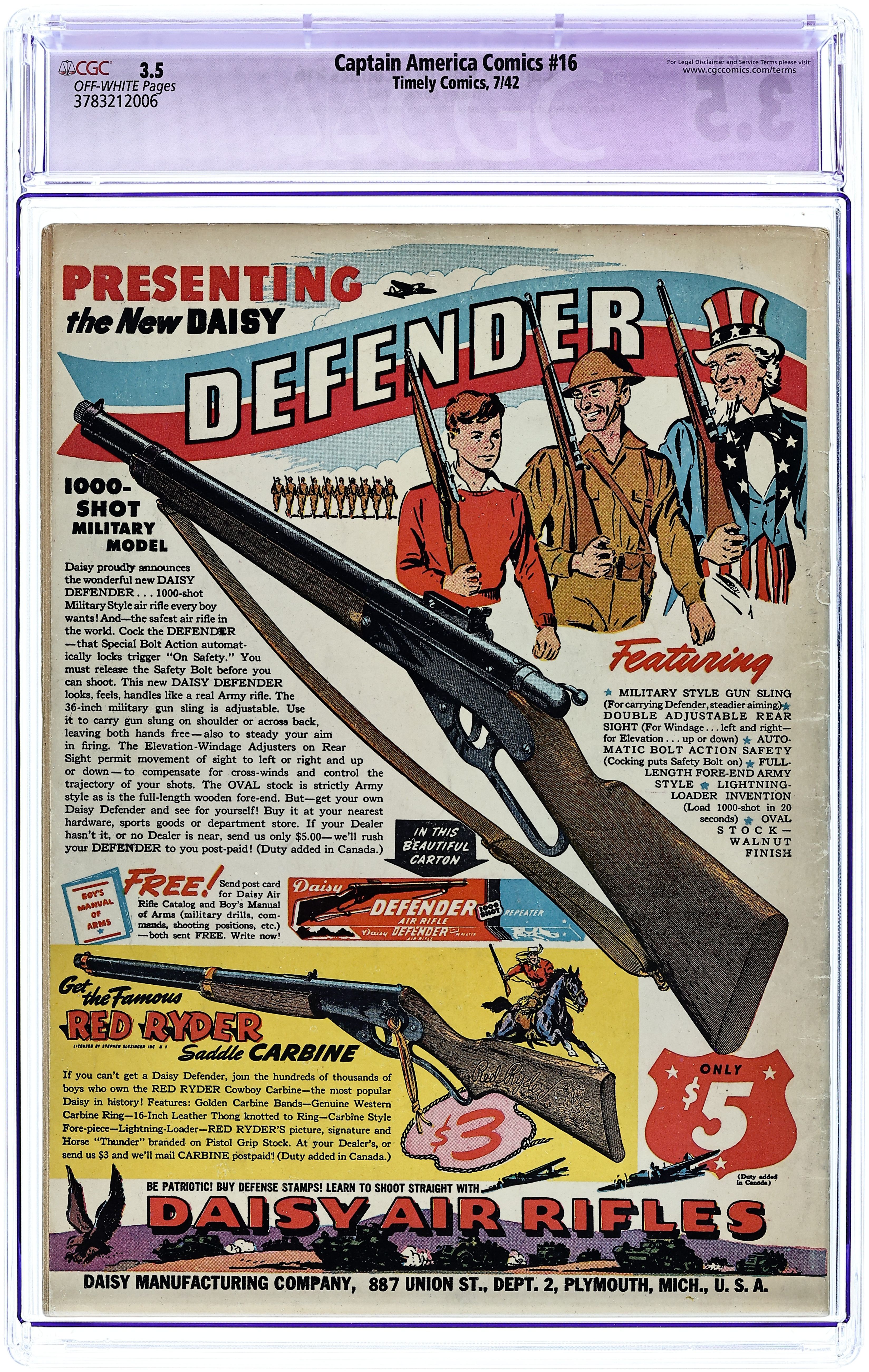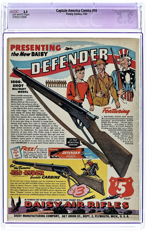 Edited by Stan Lee. Cover by Vince Alascia. Stories by Bill Finger and unknown. Art by Al Avison, Vince Alascia, Carmine Infantino, Maurice Del Bourgo, Jim Mooney and unknown. Captain America and Bucky in: "Death on the Downbeat" with art by Al Avison and Jim Mooney; "The Monkeys' Curse" with art by Vince Alascia; and "Beware the Medicine Man" with story by Bill Finger and pencils by Maurice Del Bourgo. Plus: Human Torch back-up story "The House That Haunts" with art by Carmine Infantino; Let's Play Detective 1-pager "Passport to Murder"; and 2-page text story "Date with Danger"! 48 pages, full color. Cover price $0.10.