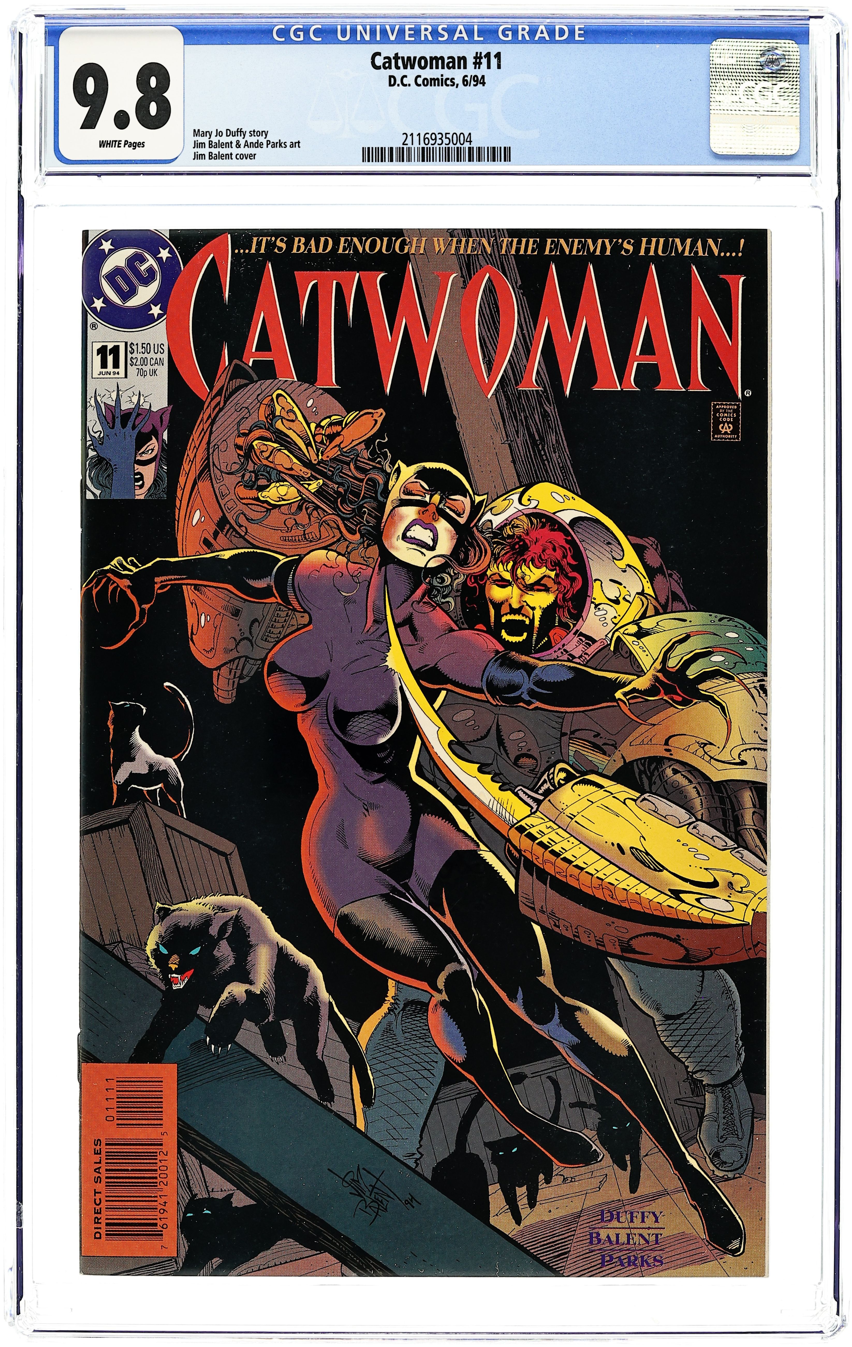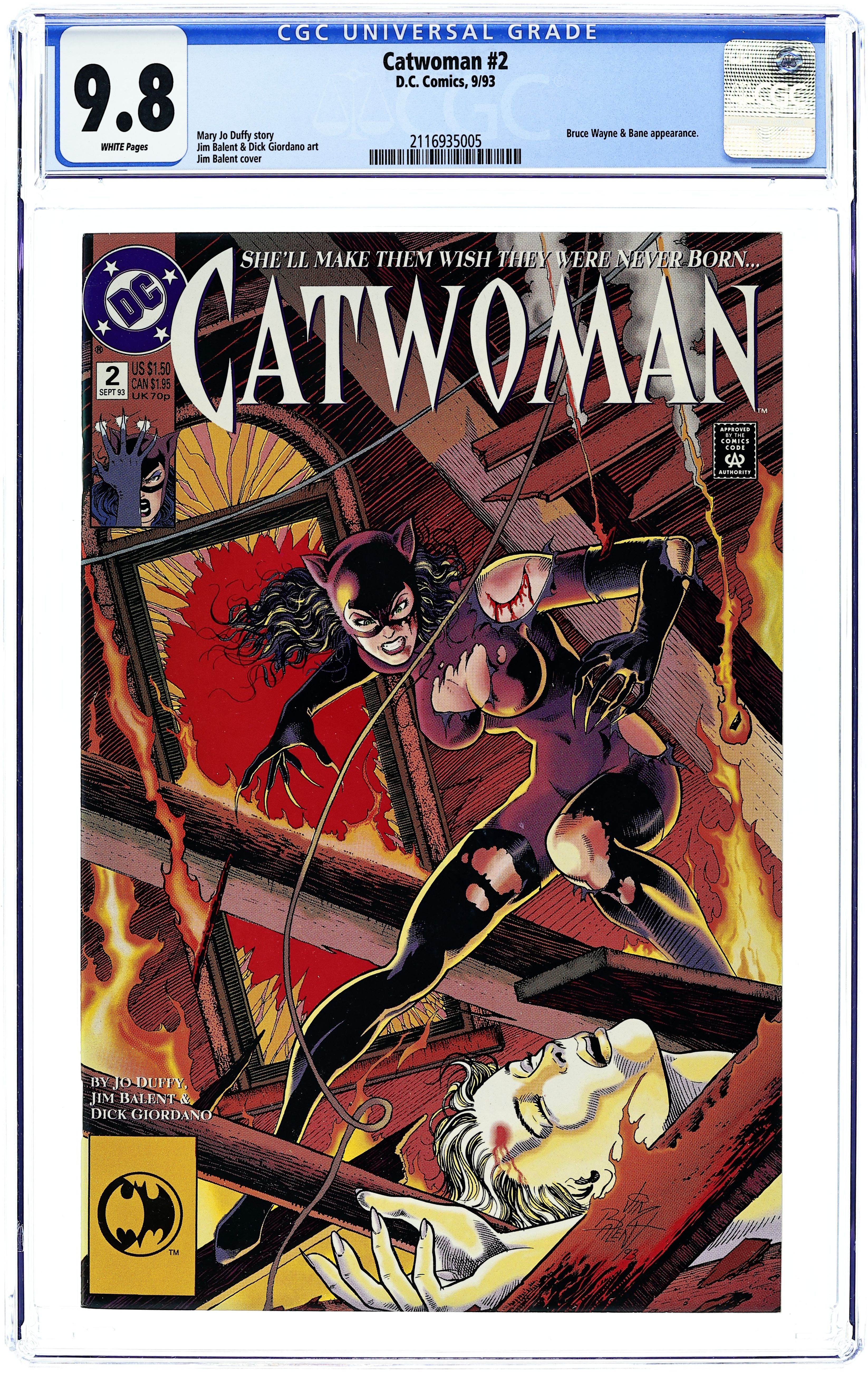Catwoman's on the trail of the assassin who fired a rocket into her apartment in "Life Lines Chapter 2: Blast from the Past!" Part 2 of 4, continued from the previous issue. Story continues next issue. Script by Jo Duffy, pencils by Jim Balent, inks by Dick Giordano. Cameos by Bane, Bruce Wayne, Alfred, Harvey Bullock. Balent cover. Cover price $1.50.