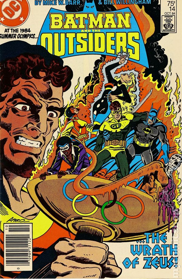 Newsstand Edition. Maxie Zeus and his New Olympians crash the 1984 Summer Olympics in "Two By Two..." Part 1 of 2, continued next issue. Script by Mike W. Barr, pencils by Bill Willingham, inks by Bill Anderson. Story takes place after the events in BATO Annual #1. Includes a cameo by the Monitor (at least his hand), who would play a vital role in Crisis On Infinite Earths. Jim Aparo cover. Cover price $0.75.